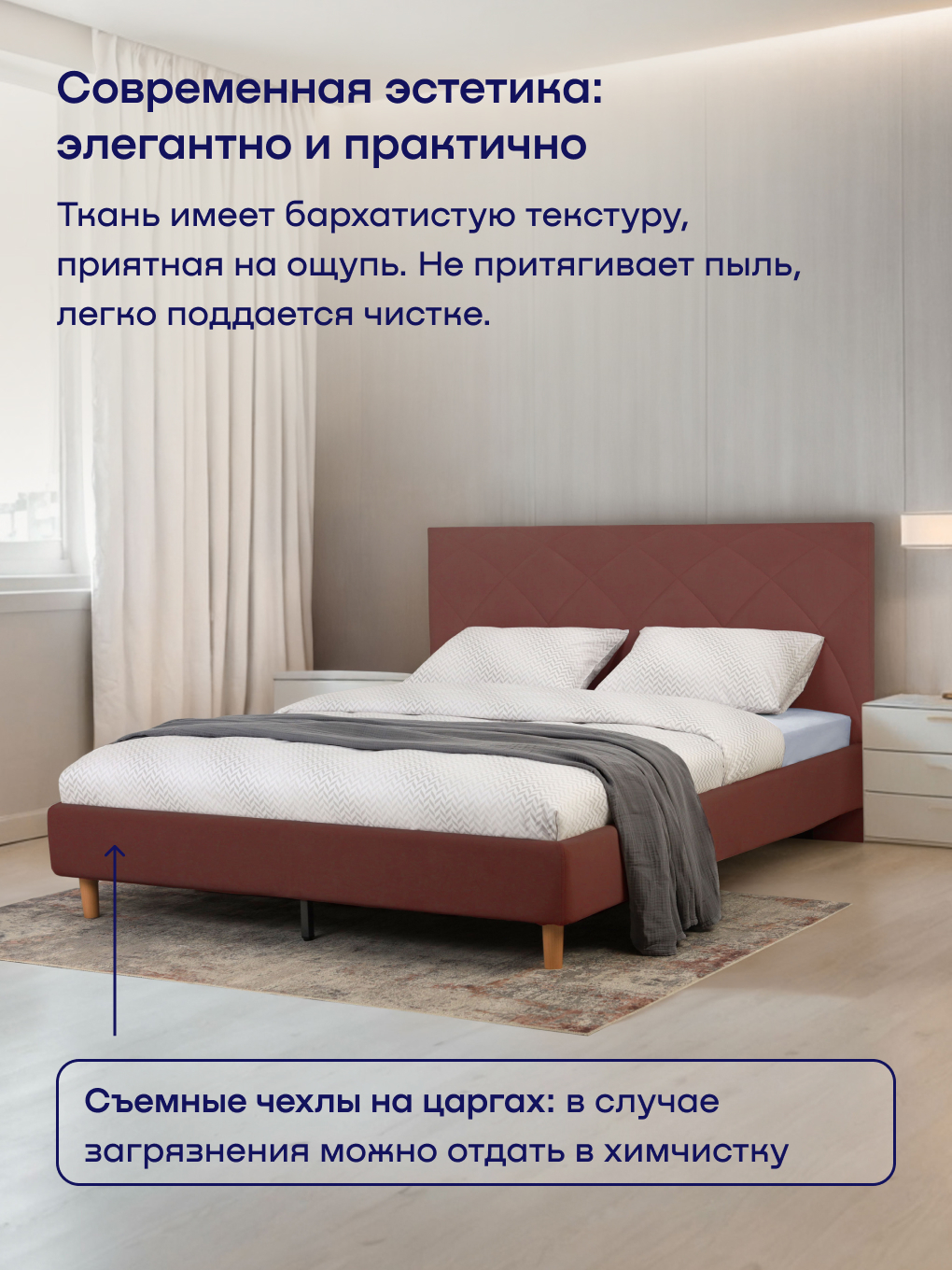 Кровать поставляется в разобранном виде в 1 коробке: без проблем помещается в легковую машину, пройдет в любой дверной проем, можно поднять на пассажирском лифте и даже на мансардный этаж дачи через узкую винтовую лестницу. Спинка аккуратно сложена пополам и легко раскладывается без деформации. Обивка из мебельного микровелюра. Этот материал не притягивает пыль и легко очищается. Классическое изголовье спинки кровати дополнено эффектной декоративной строчкой с миниатюрным рисунком, что придает модели стильный и современный вид. Устанавливается вплотную к стене (задняя часть выполнена из практичной технической ткани). Легкий и практичный уход - съемная обивка на царгах (боковины) позволяет при необходимости сдать обивку в химчистку. Такую опцию особенно оценят владельцы домашних питомцев, а также родители маленьких детей.