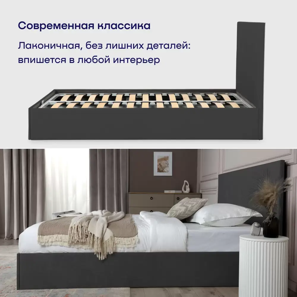 Классическая модель кровати с высоким мягким изголовьем BuyRelax сделает вашу спальню еще уютнее. Лаконичная конструкция без излишеств прекрасно впишется в любой интерьер. Долговечный обивочный материал высокого качества – мебельный велюр (микровелюр, более технологичный вариант микрофибры). Ткань приятная на ощупь, не выцветает и легко поддается чистке. Покрытие «Soft Touch» придает ткани глубокий матовый оттенок с мягким отблеском, который немного меняется в зависимости от освещения – от светло-серого до темного. Приятная на ощупь ткань, не выцветает и легко поддается чистке.