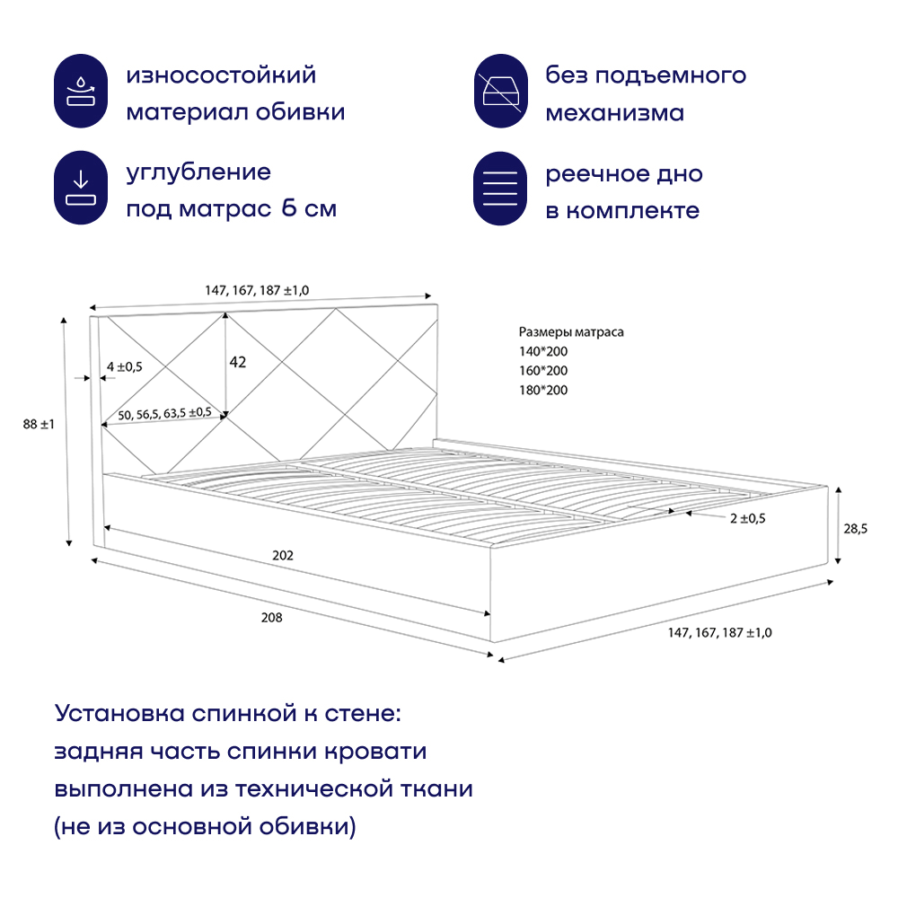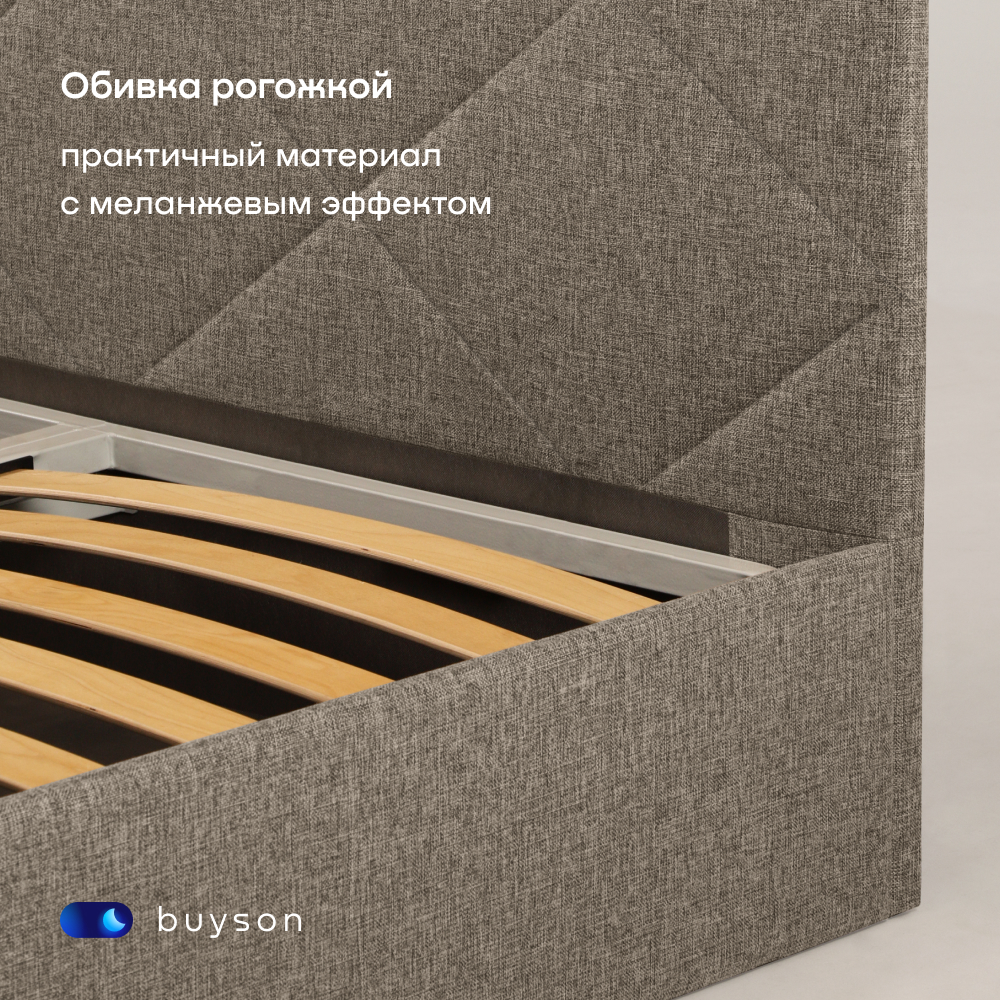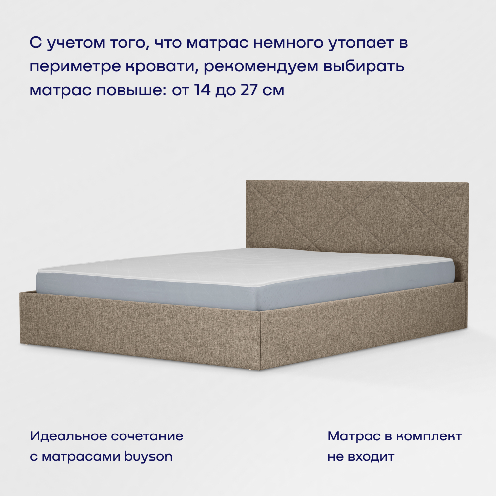 Основание с гибкими деревянными ламелями повышает ортопедические свойства матраса (обратите внимание - матрас в комплект не входит, продается отдельно). Если вы планируете купить кровать с матрасом, рекомендуем дополнить покупку матрасом того же бренда buyson в соответствующем размере – идеальное сочетание. С учетом того, что царги кровати невысокие, а матрас немного «утопает» в периметре кровати (на 6 см), рекомендуем выбрать матрас повыше – от 14 до 30 см.