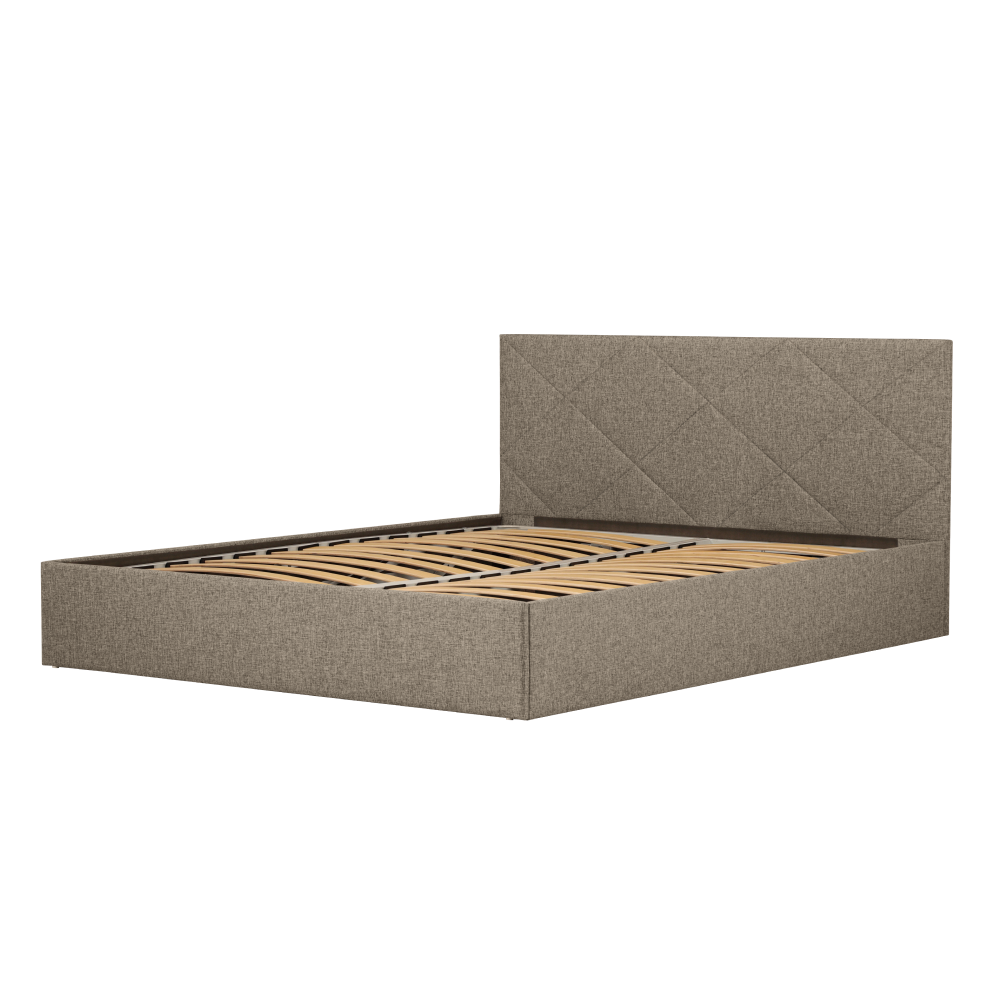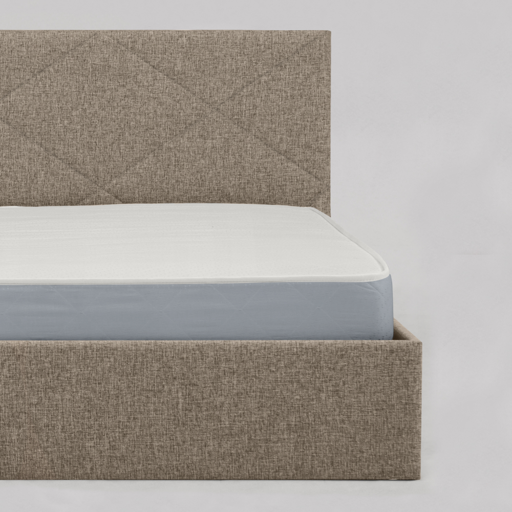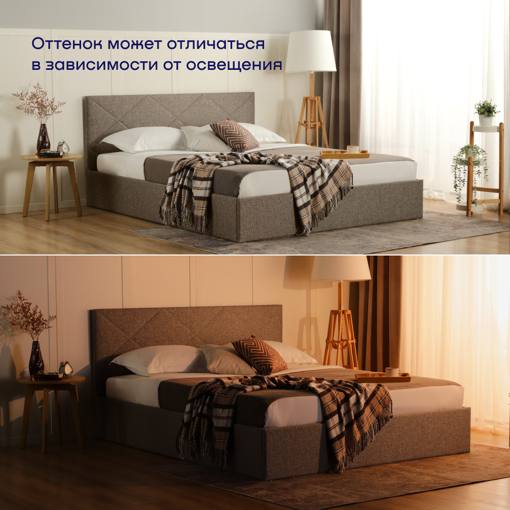 Модель на царгах в пол выглядит более эксклюзивно, чем на ножках. Мягкое изголовье с декоративной ромбовидной прострочкой, как и вся обивка кровати, выполнено из долговечного материала высокого качества – рогожки. Идеально для ценителей экостиля и очень практично. Разные варианты расцветки, на выбор: бежевая и серая. Эту же модель можно найти в ткани микровелюр.