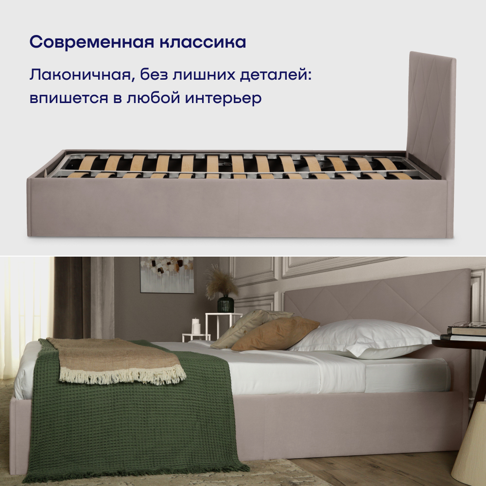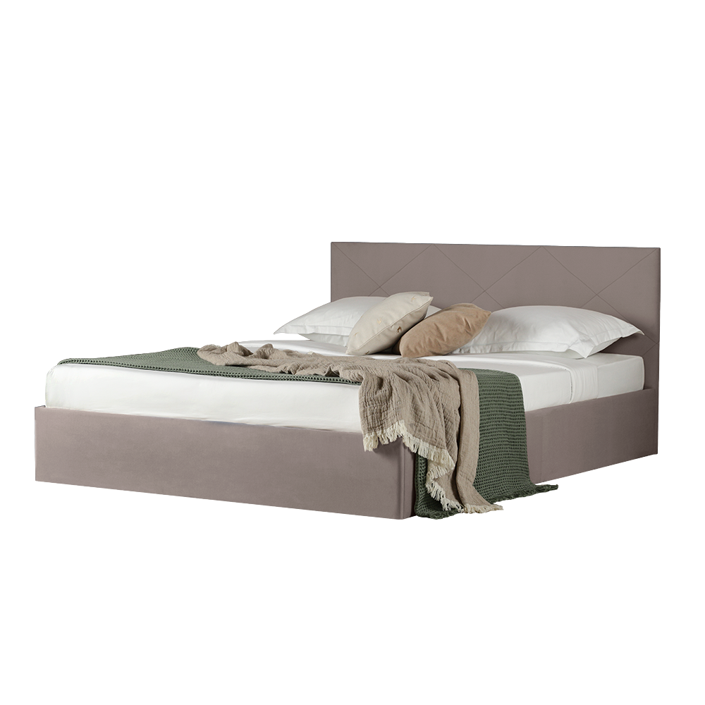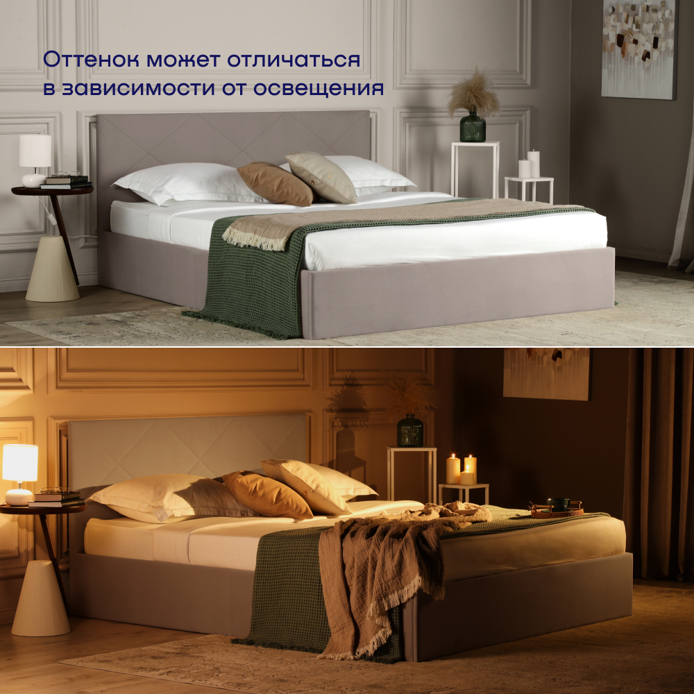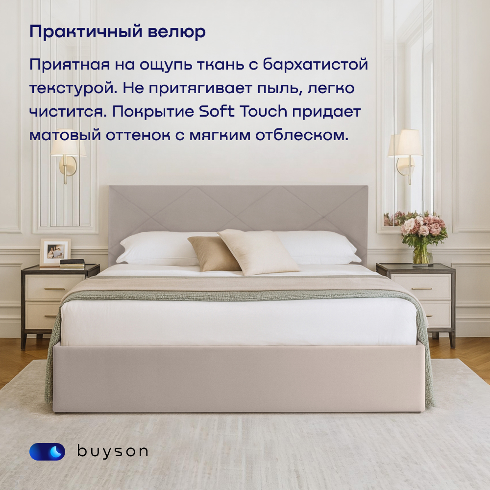Мягкое изголовье с декоративной ромбовидной прострочкой выполнено, как и вся обивка кровати, из долговечного материала высокого качества – велюра. Мебельный микровелюр – это более технологичный вариант микрофибры. Приятная на ощупь ткань, не притягивает пыль, легко поддается чистке. Покрытие «Soft Touch» придает ткани глубокий матовый оттенок с мягким отблеском, который немного меняется в зависимости от освещения.