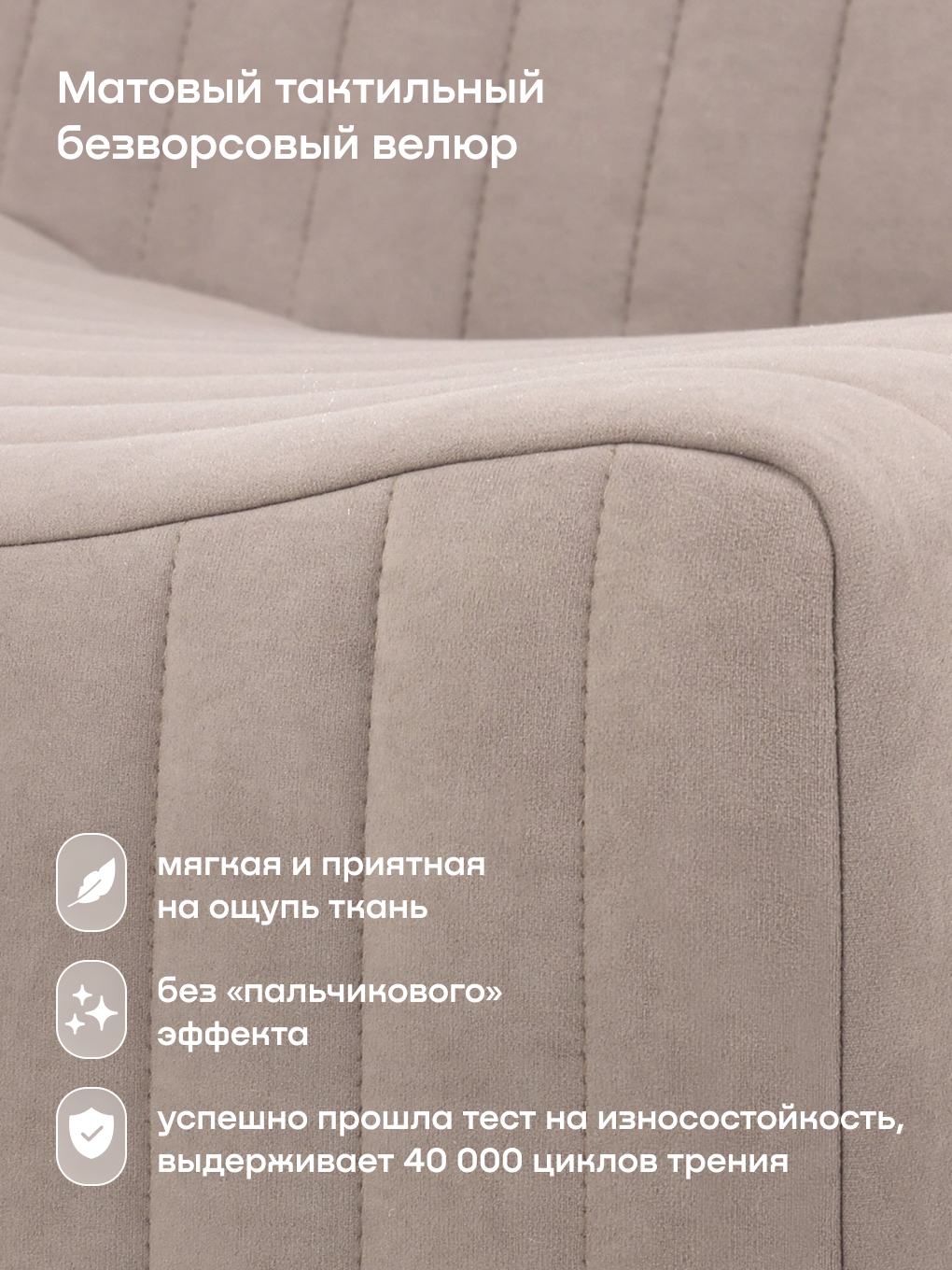 Кресло идеально подходит для семей с детьми. Мягкие линии и отсутствие жестких углов и каркаса делают его абсолютно безопасным. Чехол плотно облегает наполнитель (он несъемный, что исключает деформацию при эксплуатации), выполнен из эстетичного матового велюра без ворса. Обивка прочная, не имеет «пальчикового эффекта» и легко чистится.