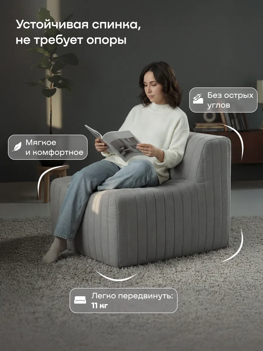 Главное преимущество — легкость и мобильность. Вес кресла составляет всего 11 кг, поэтому вы без труда сможете переставить его из комнаты в комнату, вынести на балкон или взять с собой на дачу. Купил, распаковал и пользуешься где хочешь — хоть в гостиной, хоть в детской. Мебель приезжает к вам в компактной вакуумной упаковке (в скрутке). Это удобно для заказа онлайн и перевозки в любом автомобиле. Креслу не нужна сборка, оно не скрипит и не ломается.
