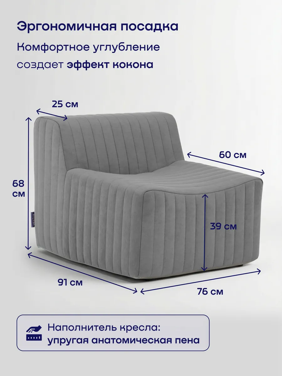 В основе комфорта — плотная анатомическая пена. Вопреки стереотипам о бескаркасной мебели, это наполнитель, который хорошо держит форму и отлично держит вес (нагрузка до 100 кг). Вы не проваливаетесь в бесформенную массу: упругая пена обеспечивает надежную поддержку, снимает нагрузку с позвоночника и дарит ощущение покоя. Эргономичная выемка и полноценная опора спинки создают эффект «кокона», позволяя полностью расслабиться.
