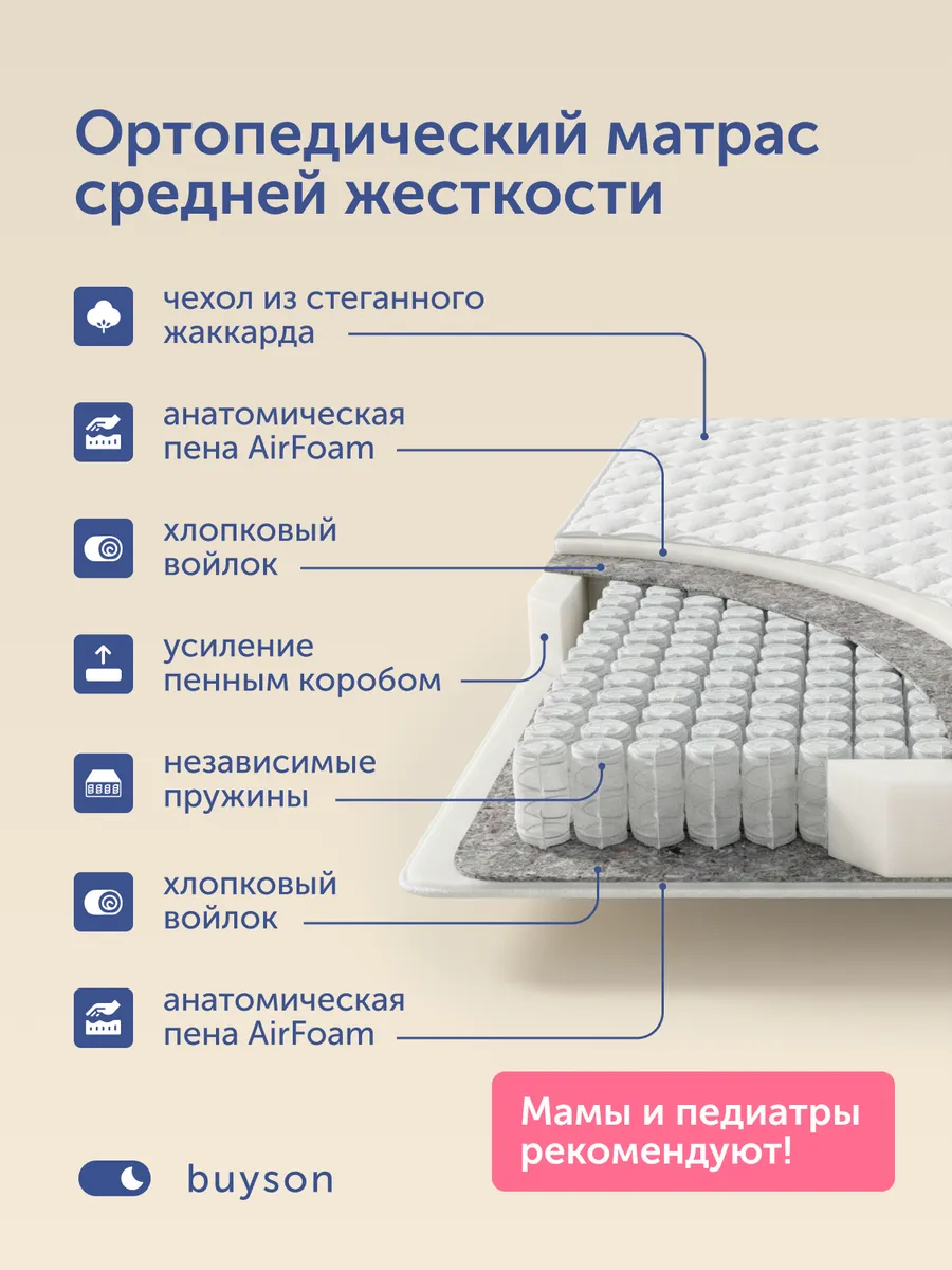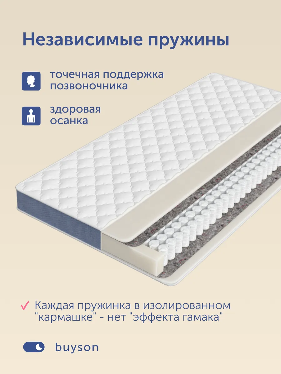 Двухсторонний матрас BuySunny – это находка для родителей, которые желают только лучшего для своего ребенка. Независимый пружинный блок Minipocket обеспечивает анатомически правильное положение позвоночника, что важно для его формирования. Наполнитель из хлопкового войлока и эластичной пены AirFoam улучшает воздухообмен внутри конструкции. Высокий уровень комфорта подарит крепкий сон без частых пробуждений.