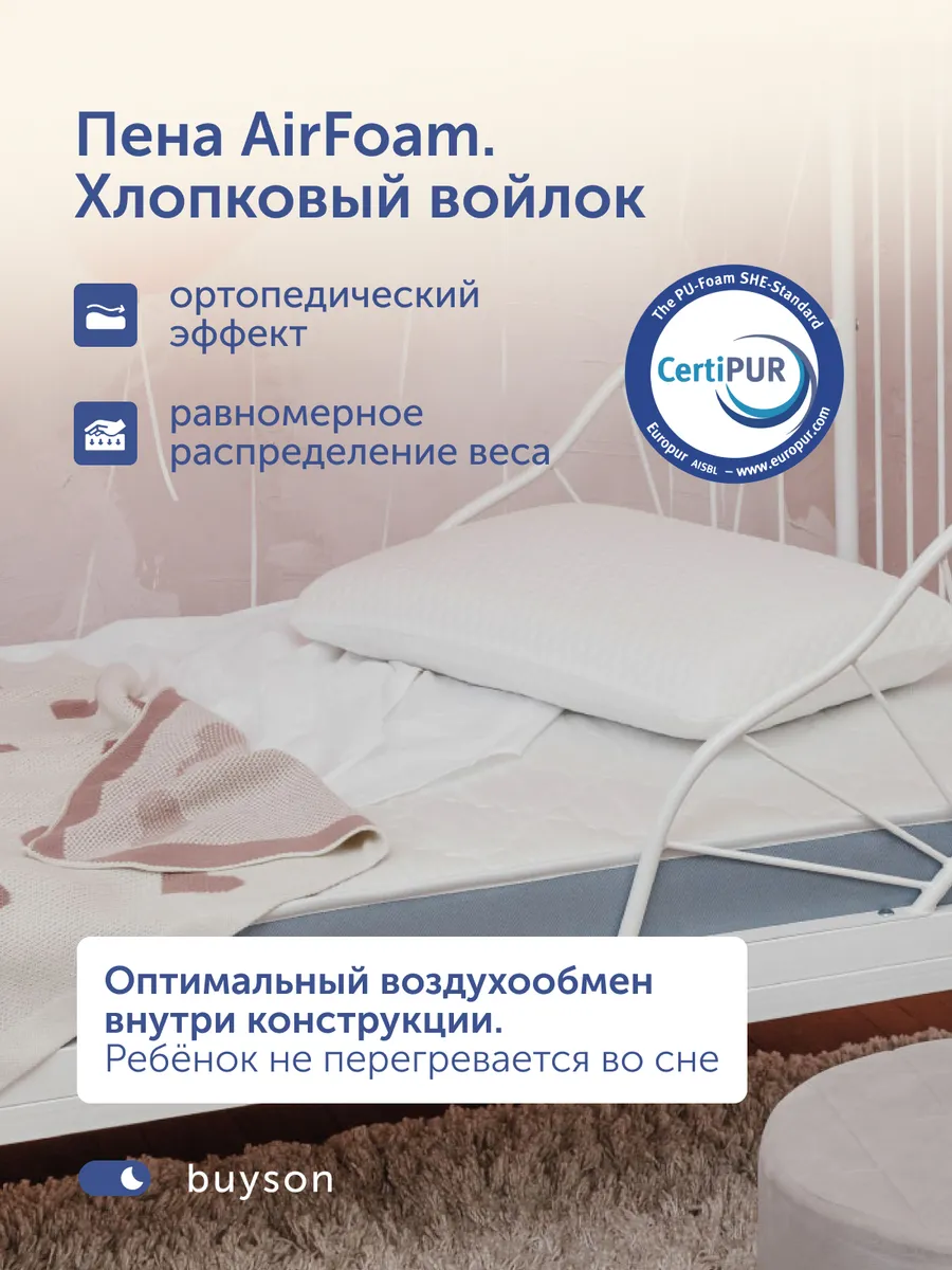 Выбирайте матрас в кровать по размеру спального места. К матрасам 80х200 или 90х200 см можно купить защитный чехол в том же размере. Соберите детскую капсулу сна buyson set: подушка + одеяло. Или можно подобрать одеяло из взрослого ассортимента в самом маленьком размере 140х205 см. buyson — легко купить и комфортно спать.