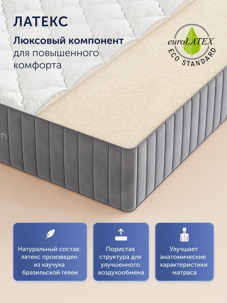 Высокий независимый пружинный блок обеспечивает индивидуальную поддержку и ортопедический эффект, а благодаря верхним слоям из пены с эффектом памяти, латекса и воздушной пены AirFoam подстраивается под естественные изгибы тела. Повышенная жесткость ощущается умеренно, гарантируя непревзойденный комфорт.