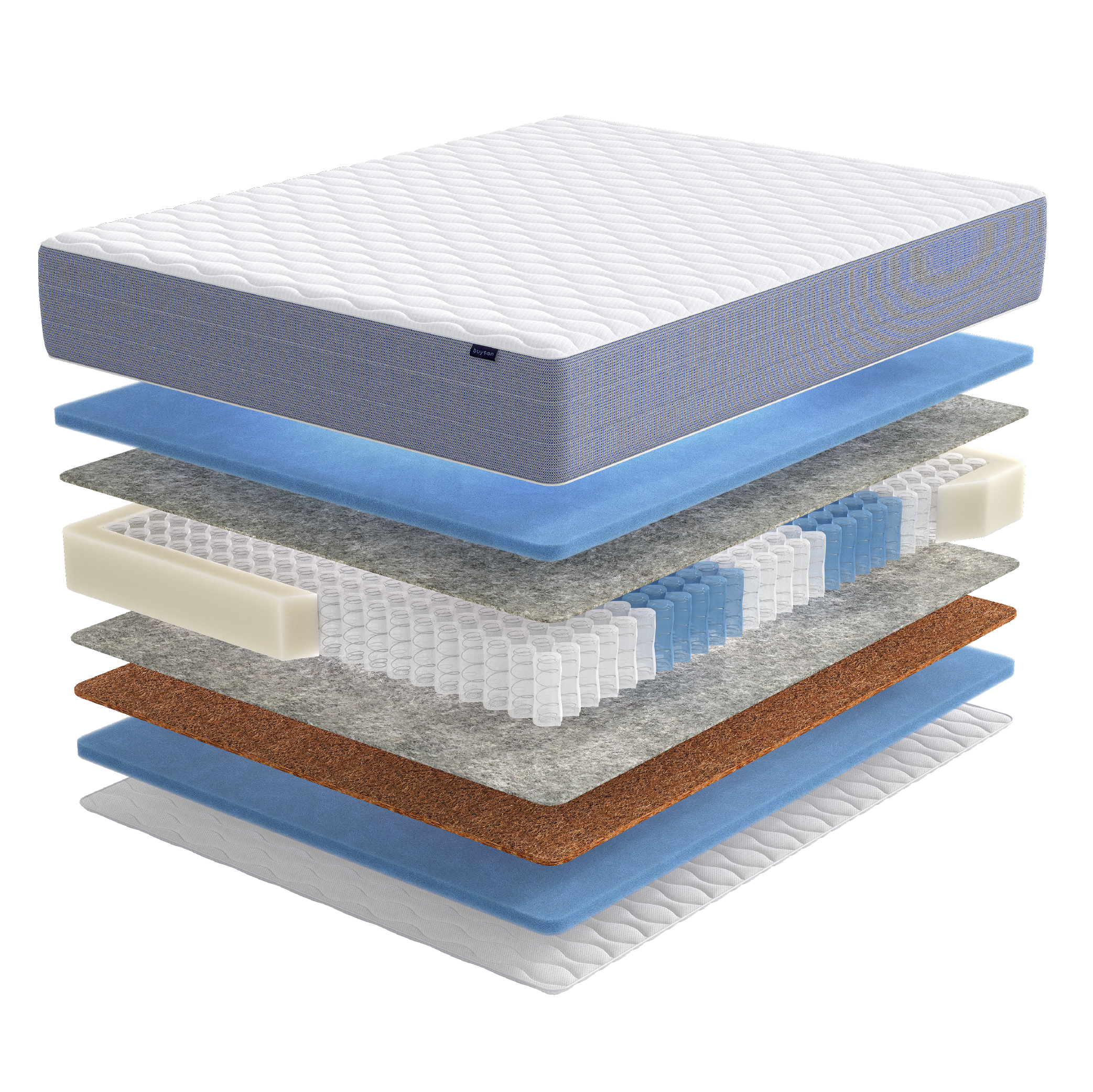 Важно: при использовании матраса на кровати с реечным дном (с гибкими ламелями), убедитесь, что максимальное расстояние между рейками не превышает 8 см, иначе возможна деформация матраса. Все матрасы buyson прекрасно сочетаются с кроватями нашего бренда.
