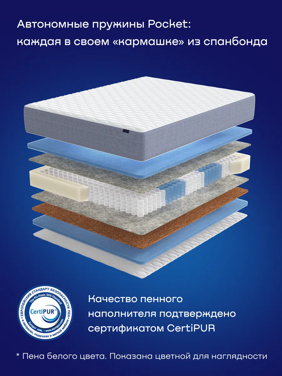 Пружинный блок Pocket выдерживает высокие нагрузки и обеспечивает правильную поддержку всего тела. Кокосовая койра отвечает за повышенную жесткость и создает более комфортный микроклимат, обеспечивая хорошую циркуляцию воздуха. Это натуральное природное волокно отличается прочностью и эластичностью, хорошо пропускает воздух и устойчиво к влаге.