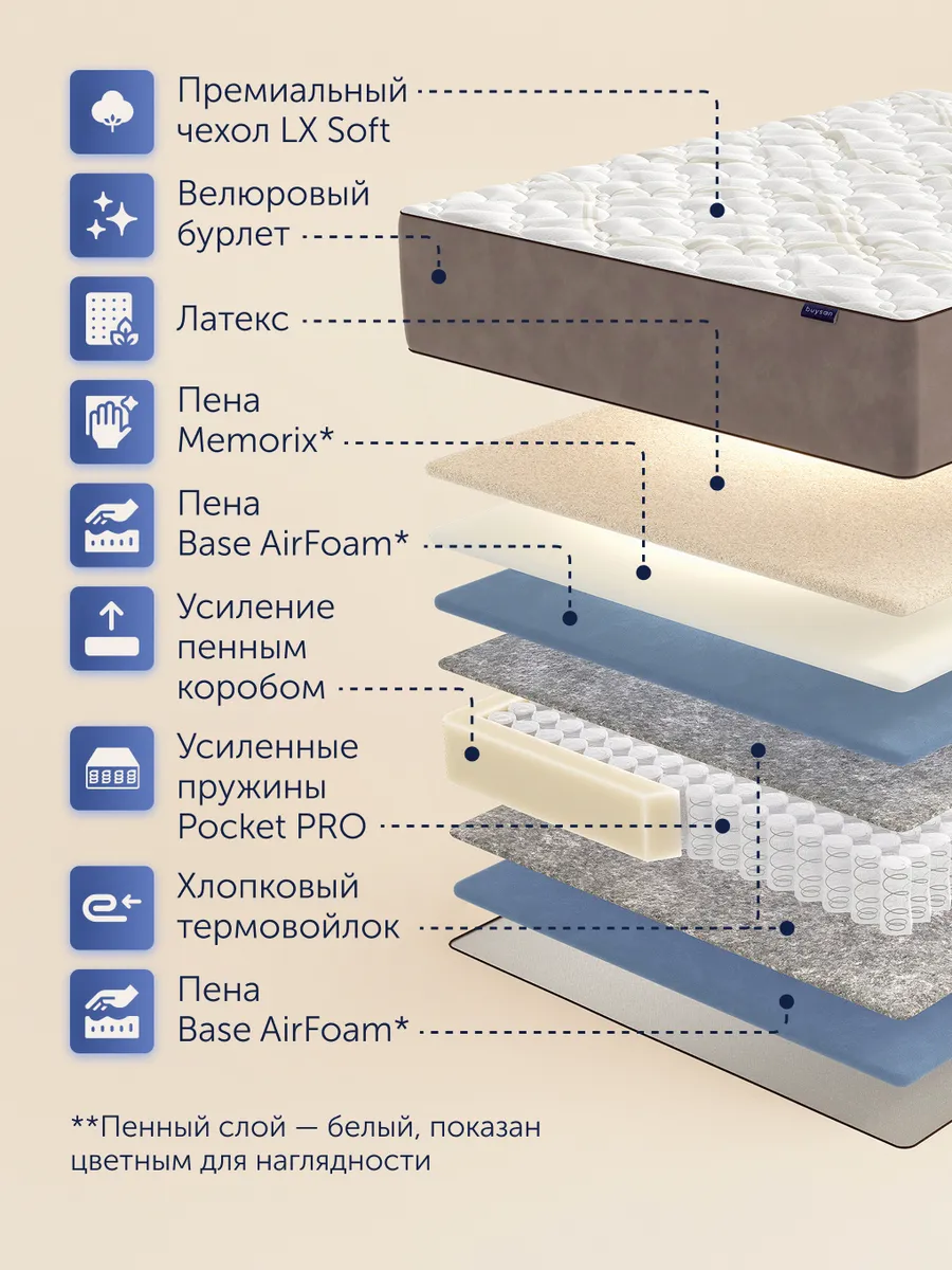 Упругий натуральный латекс улучшает анатомические характеристики матраса, а пена Memorix отлично подстраивается индивидуально под вас, мягко адаптируясь без обратного давления, что хорошо для кровообращения восстановления мышц.