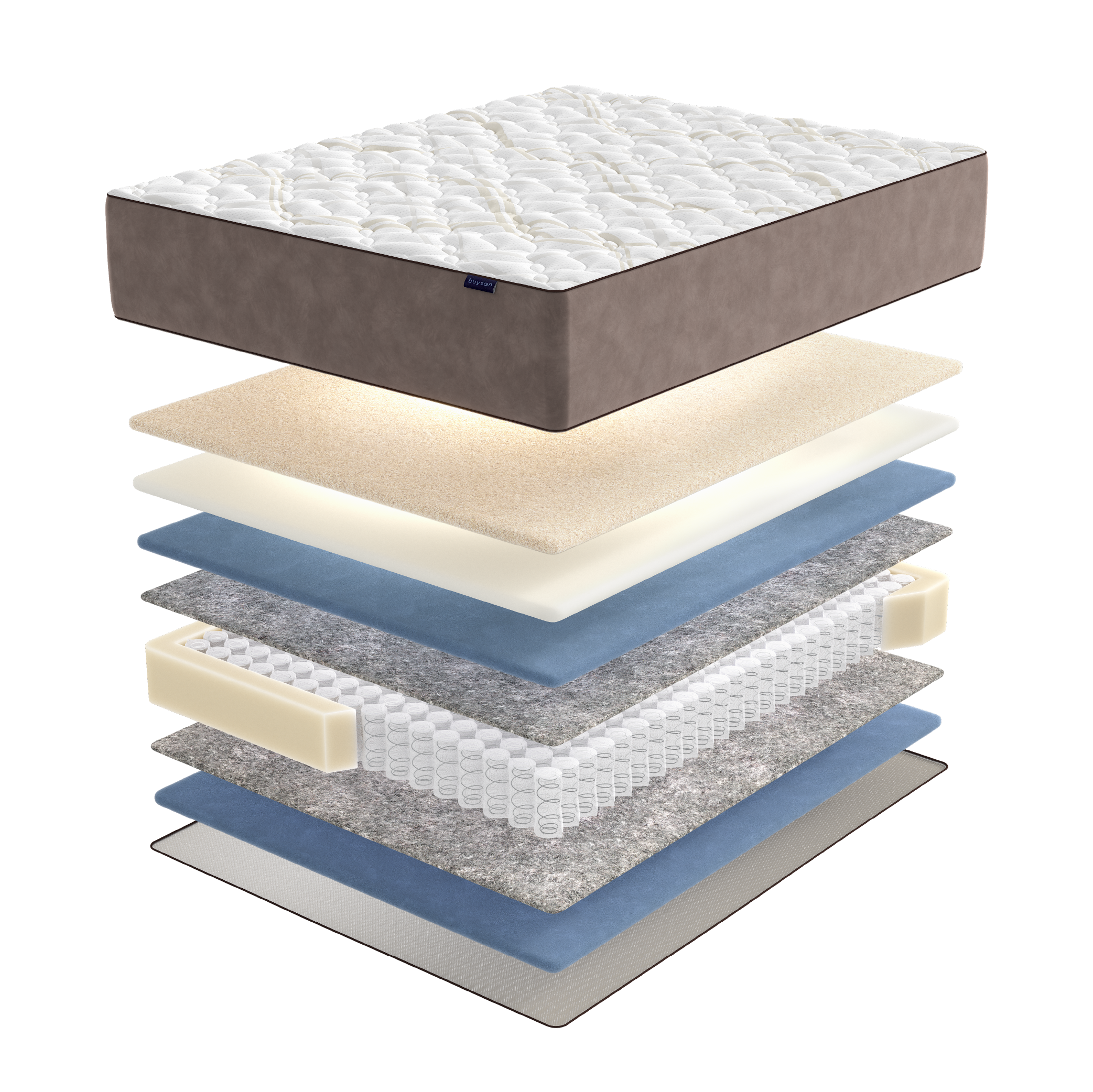 На какие слои, помимо пены и пружинного блока, стоит обратить внимание? Сейчас в тренде экологичные материалы, которые качественно улучшают ортопедические свойства и повышают уровень комфорта. Кокосовая койра отвечает за повышенную жесткость в матрасах и создает более комфортный микроклимат. Это натуральное природное волокно отличается прочностью и эластичностью, хорошо пропускает воздух и устойчиво к влаге. Хлопковый войлок решает сразу несколько задач: укрепляет каркас матраса, повышает упругость всей конструкции, способствует хорошему воздухообмену и обладает прекрасной способностью терморегуляции: летом такой матрас лучше держит прохладу, а зимой помогает аккумулировать тепло.