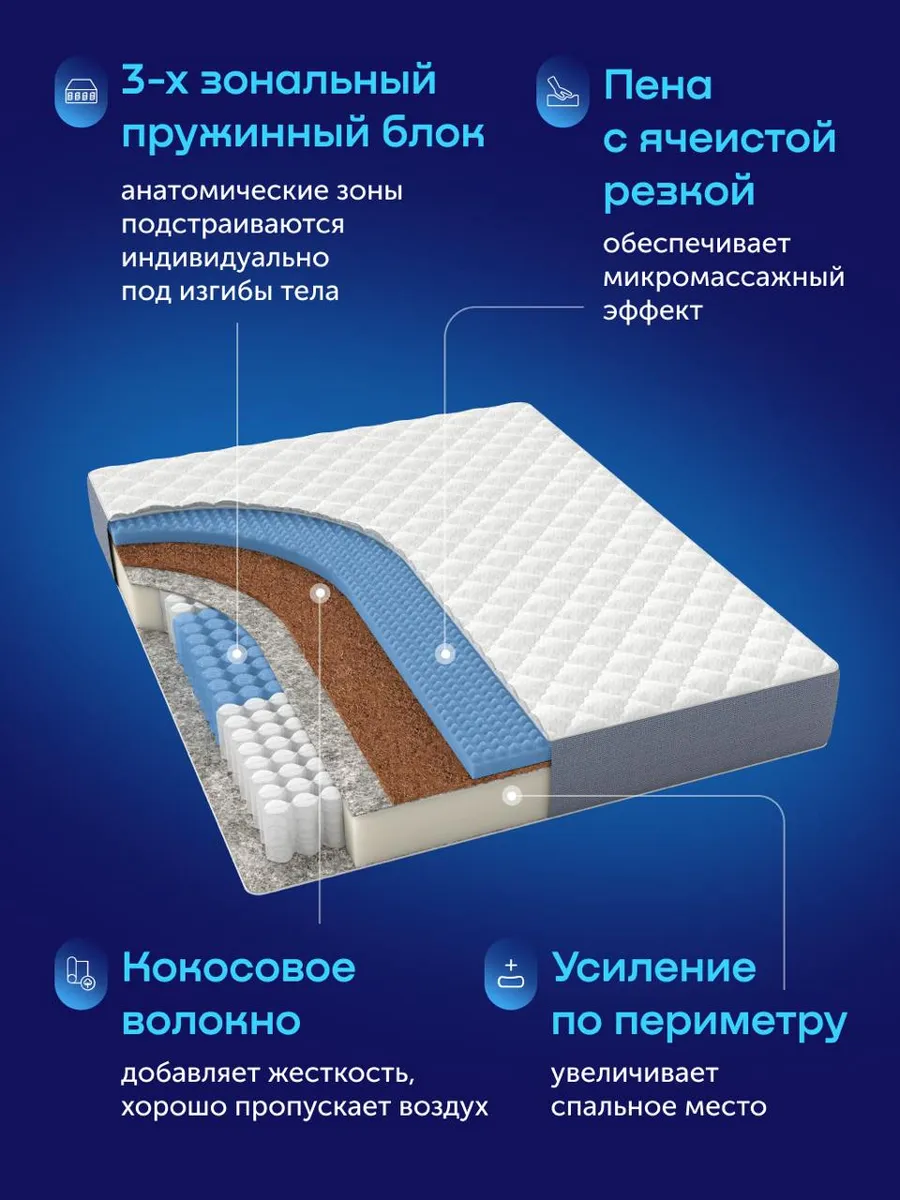 Независимый пружинный блок идеально подстраивается под изгибы вашего тела, равномерно распределяет нагрузку и обеспечивает упругую и точечную поддержку позвоночника. Спальная поверхность разделена на три зоны комфорта – для головы, средней части тела и ног. У каждой индивидуальная степень жесткости, оптимальная для точечной поддержки. Матрас также подойдет людям с большой массой тела.