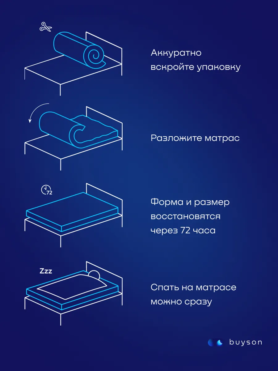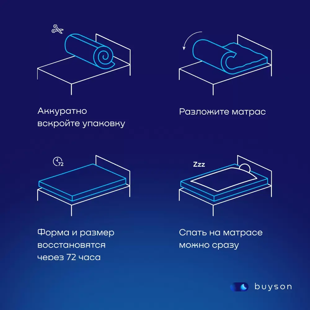Стеганый чехол матраса сшит из приятного на ощупь трикотажа. Пена с массажным эффектом обеспечивает правильное положение во сне и создает дополнительный комфорт. Матрас Байсон представлен в широкой размерной линейке — односпальный вариант 200*080 и 200*090, а также двуспальный 200*140, 200*160 и 200*180 см. Используемые материалы безопасны и гипоаллергенны. Компактная и удобная упаковка: матрас доставляется в скрученном виде (в рулоне). После вскрытия упаковки матрас в скрутке полностью распрямится и восстановит свою форму в соответствии с заявленным размером через 72 часа. Спать на матрасе можно сразу же после распаковки.