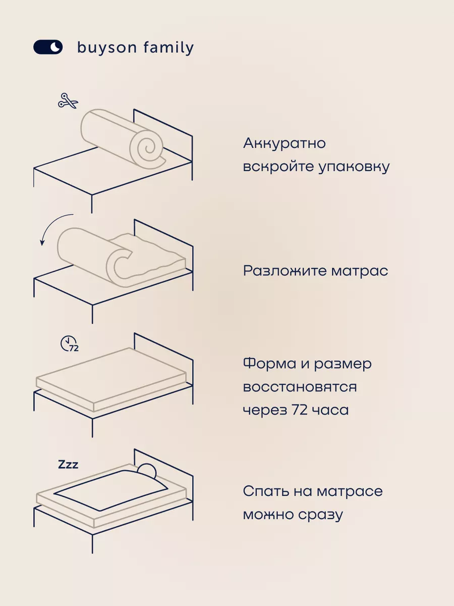 Удобно и для заказа домой, и для дачи. Предусмотрены ручки для удобной переноски. После вскрытия упаковки матрас в скрутке полностью распрямится и восстановит свою форму в соответствии с заявленным размером через 72 часа. Спать на матрасе можно сразу же после распаковки.