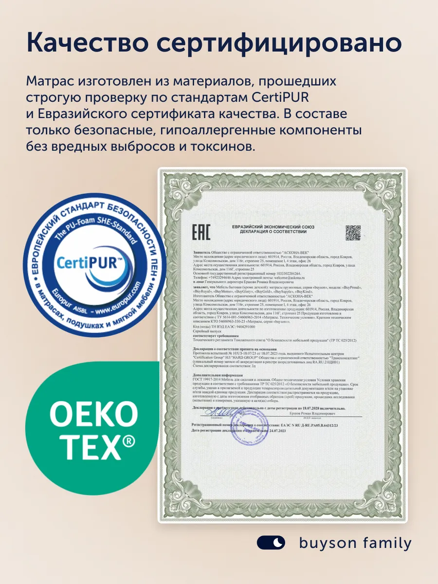 Роскошный пружинный матрас BuyRoyal из коллекции buyson family подарит вам королевский сон с пользой для здоровья вашей спины! Высокий – 29 см, с жестким независимым пружинным блоком и комфортным верхним слоем. Наполнитель чехла матраса – воздушная комбинация полиэфирного волокна и пены, что добавляет немного мягкости для сна на матрасе, у которого жесткость выше средней. И дополняет картину эффектный вид чехла – эксклюзивный принт на белом фоне гармонично сочетается с темным велюровым бурлетом. Плотный трикотаж приятен на ощупь, с объемной рельефной простежкой и кантом по периметру.