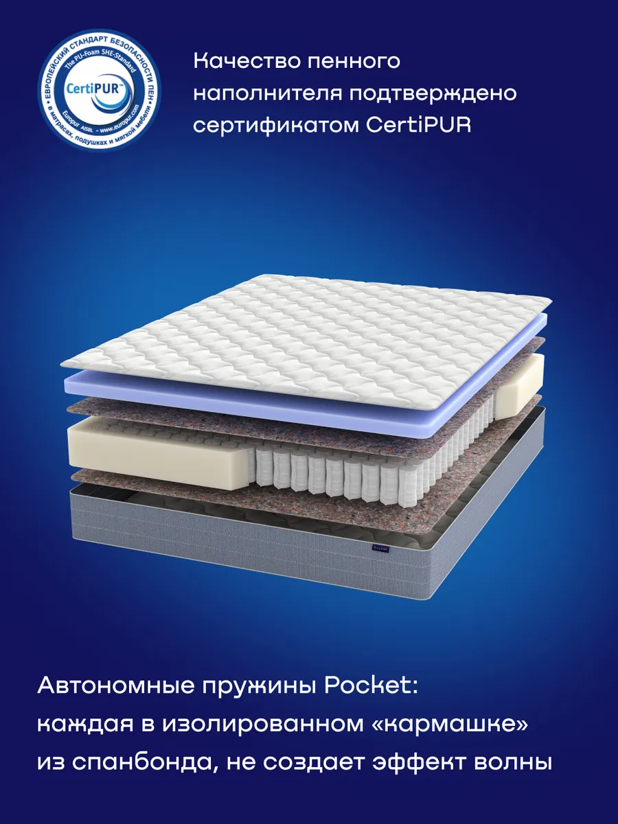 Этот товар приедет к вам в суперкомпактной упаковке, которая без проблем поместится в любой легковой автомобиль – удобно для транспортировки, идеально для дома и дачи. Больше ничто не потревожит ваш сон благодаря особенной конструкции независимого пружинного блока карманного типа Pocket. Каждая пружинка автономна, в своем кармашке из спанбонда, что нивелирует любые колебания и движения на противоположной стороне. Обеспечивает ортопедический эффект: матрац с независимыми пружинами деликатно подстраивается под изгибы тела, равномерно распределяет нагрузку и обеспечивает точечную поддержку позвоночника.