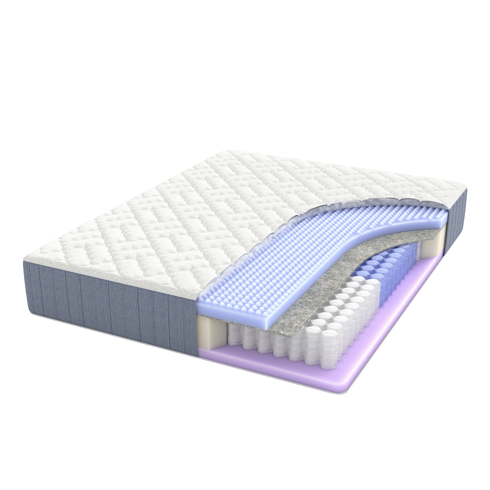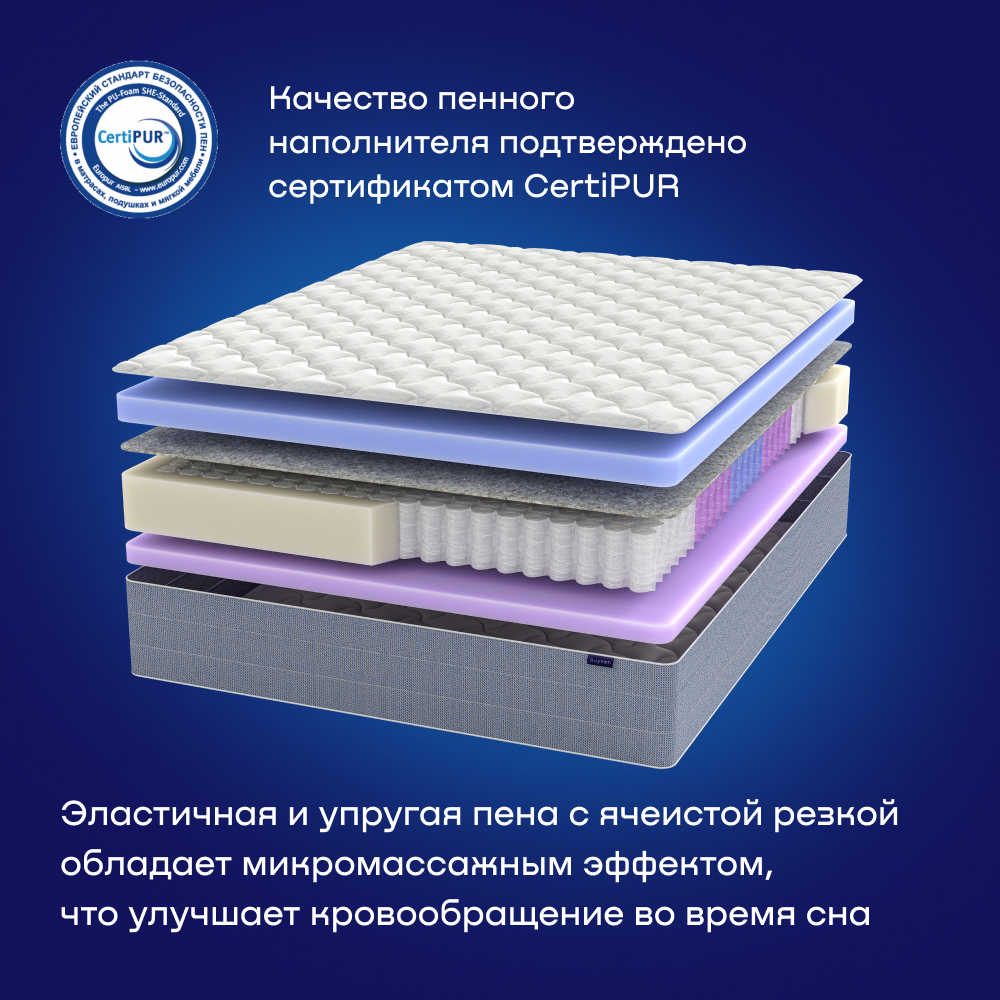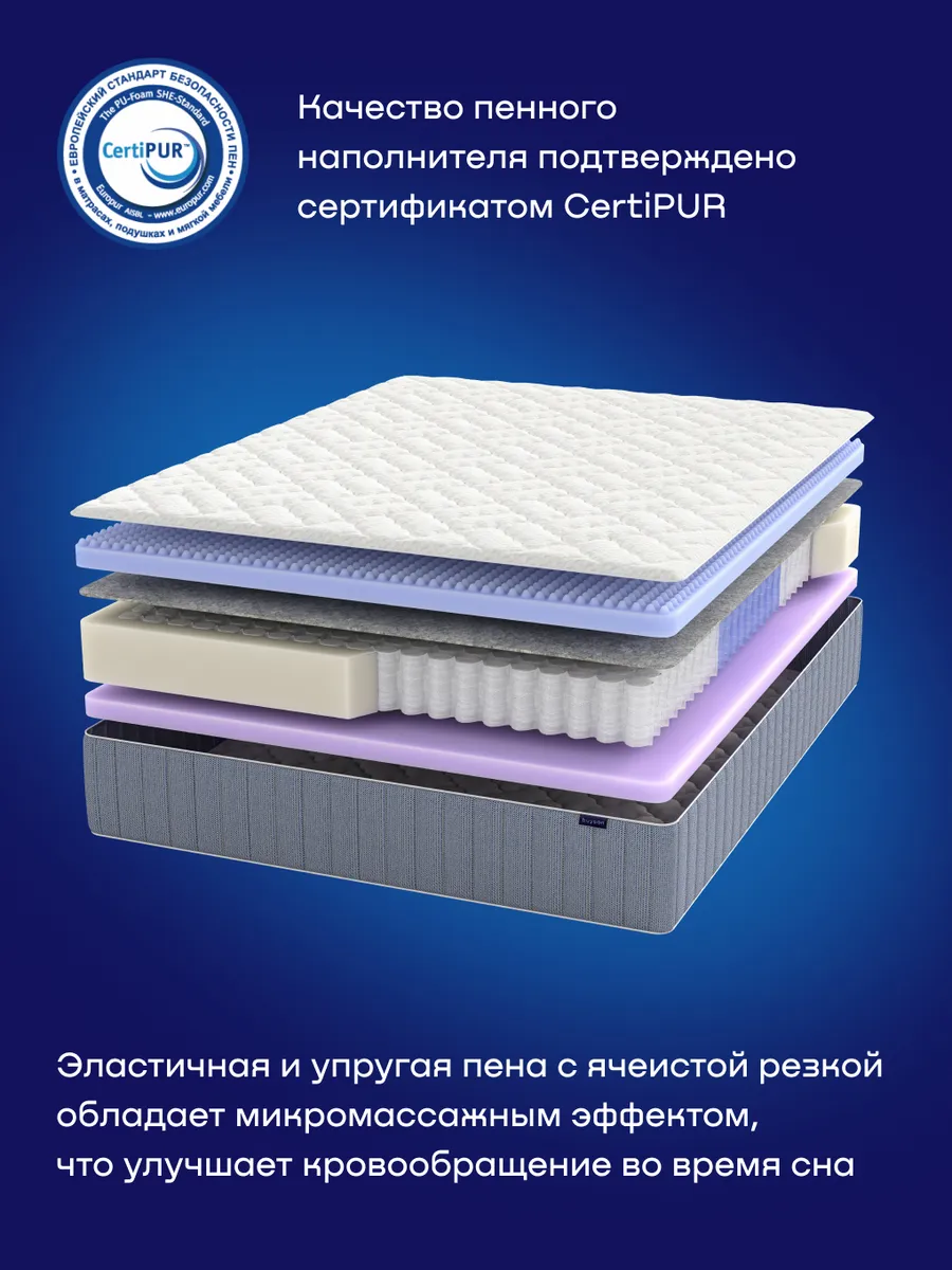 Верхний слой наполнителя из ячеистой пены подстраивается под вас, обеспечивая легкий массажный эффект, а также улучшает воздухообмен – важно для терморегуляции. Удобно спать в любой позе – на животе, спине, боку.
