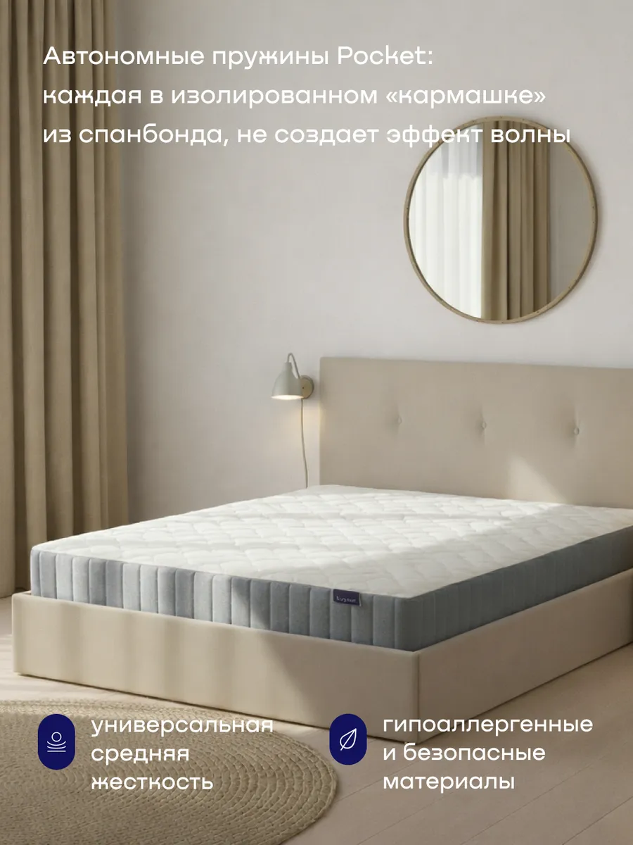 Независимый пружинный блок карманного типа Pocket распределяет нагрузку и обеспечивает точечную поддержку позвоночника. Каждая пружинка автономна, в своем кармашке из спанбонда. Это нивелирует колебания и движения на противоположной стороне – идеально для пар.