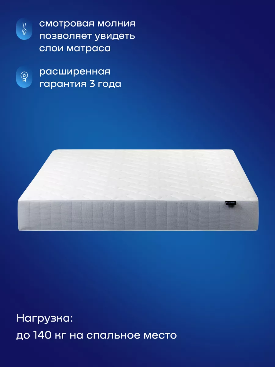 Матрас односторонний, не требует переворачивания «верх/низ». Гипоаллергенный состав. Нагрузка до 140 кг на спальное место. Гарантия 3 года.