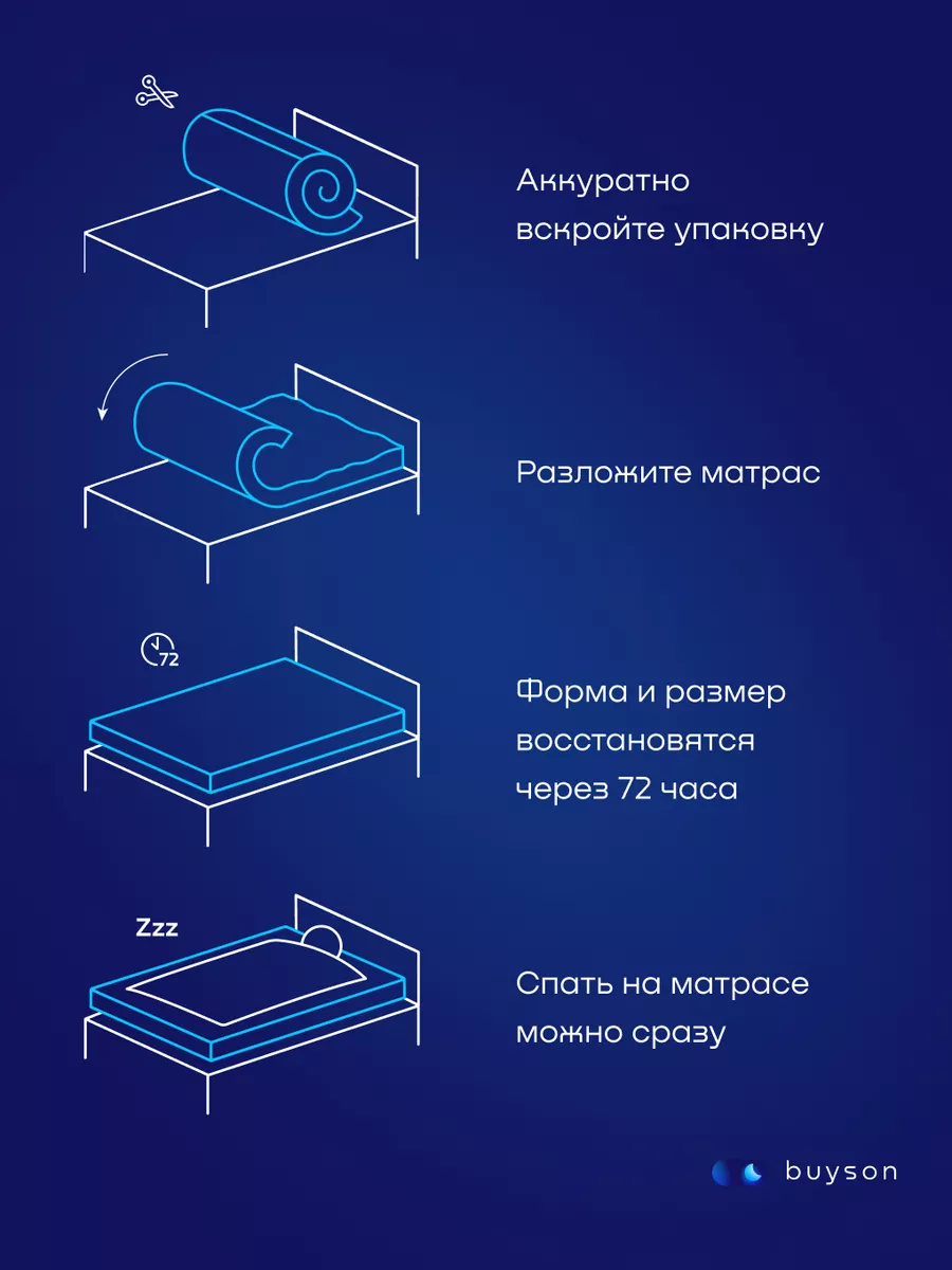 Этот товар приедет к вам в компактном, скрученном виде, без проблем поместится в любой легковой автомобиль – удобно для транспортировки, идеально для дома и дачи. После вскрытия упаковки матрас в скрутке полностью распрямится и восстановит свою форму в соответствии с заявленным размером через 72 часа.