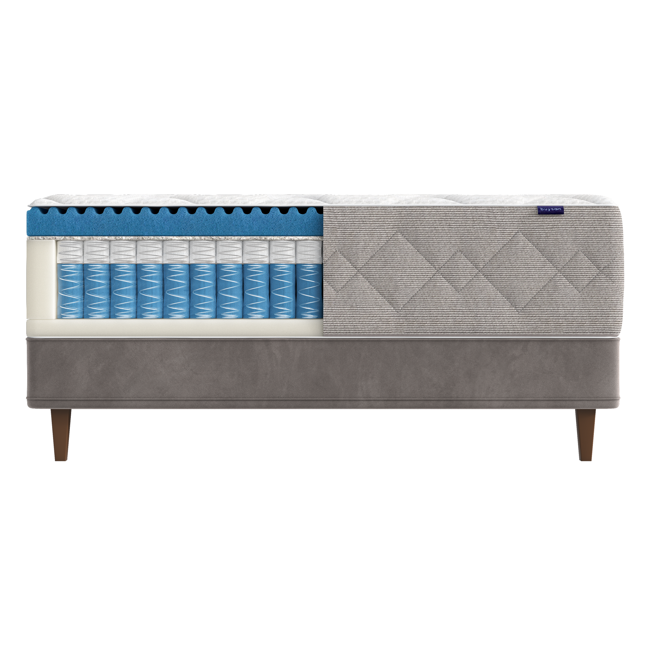 Важно: при использовании матраса на кровати с реечным дном (с гибкими ламелями), убедитесь, что максимальное расстояние между рейками не превышает 8 см, иначе возможна деформация матраса. Все матрасы buyson прекрасно сочетаются с кроватями нашего бренда.