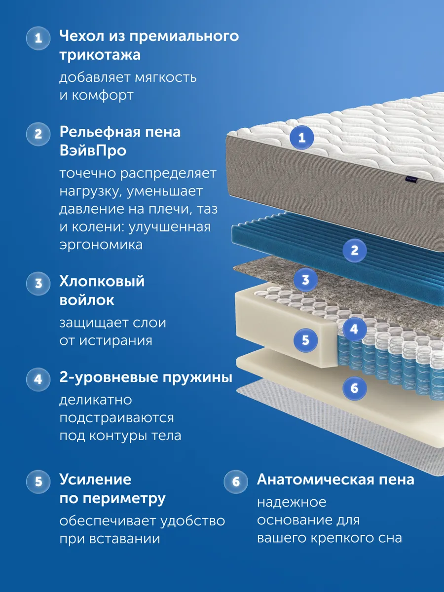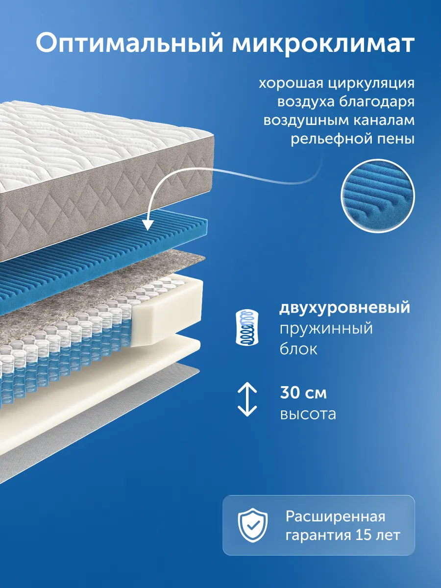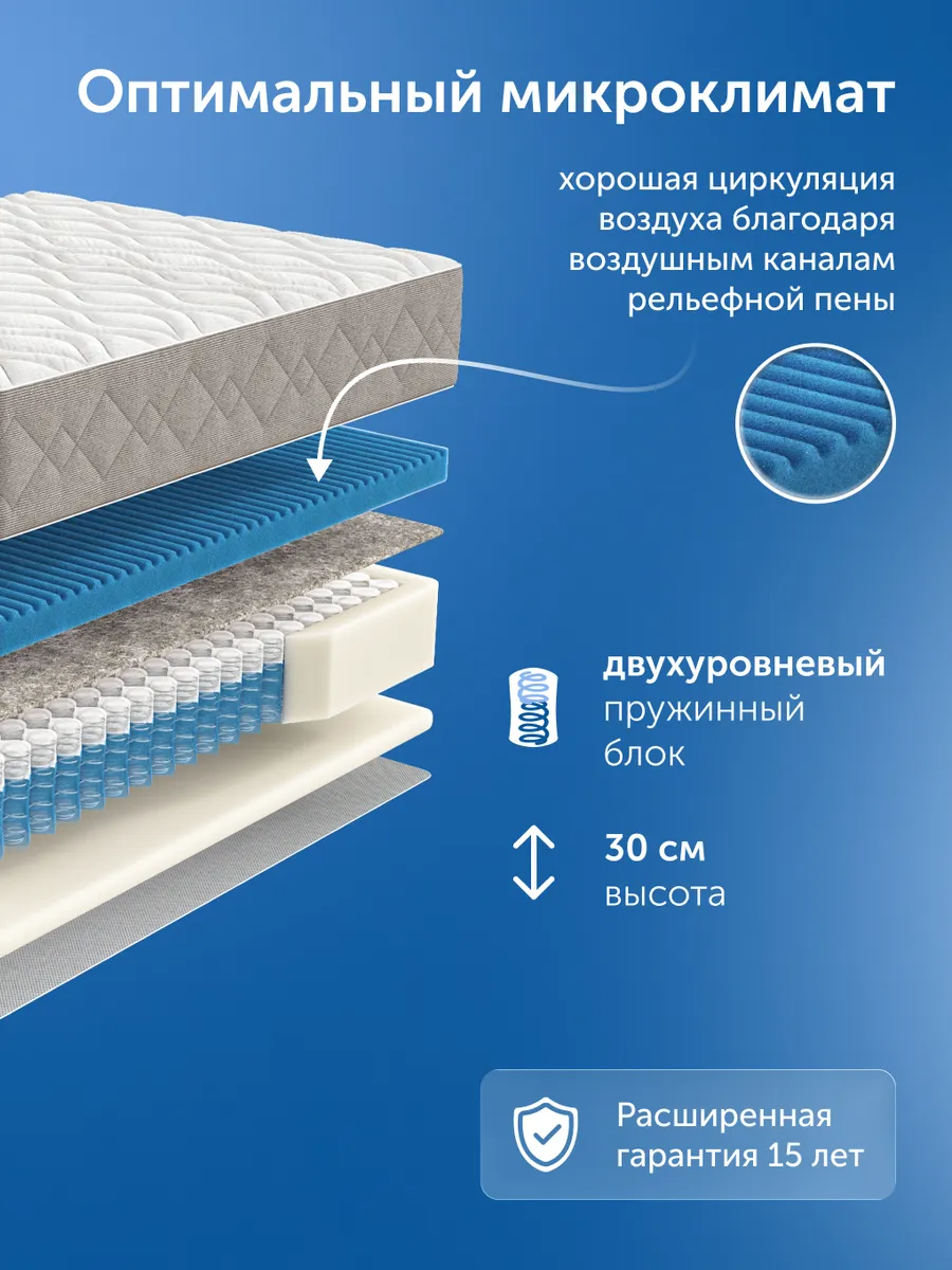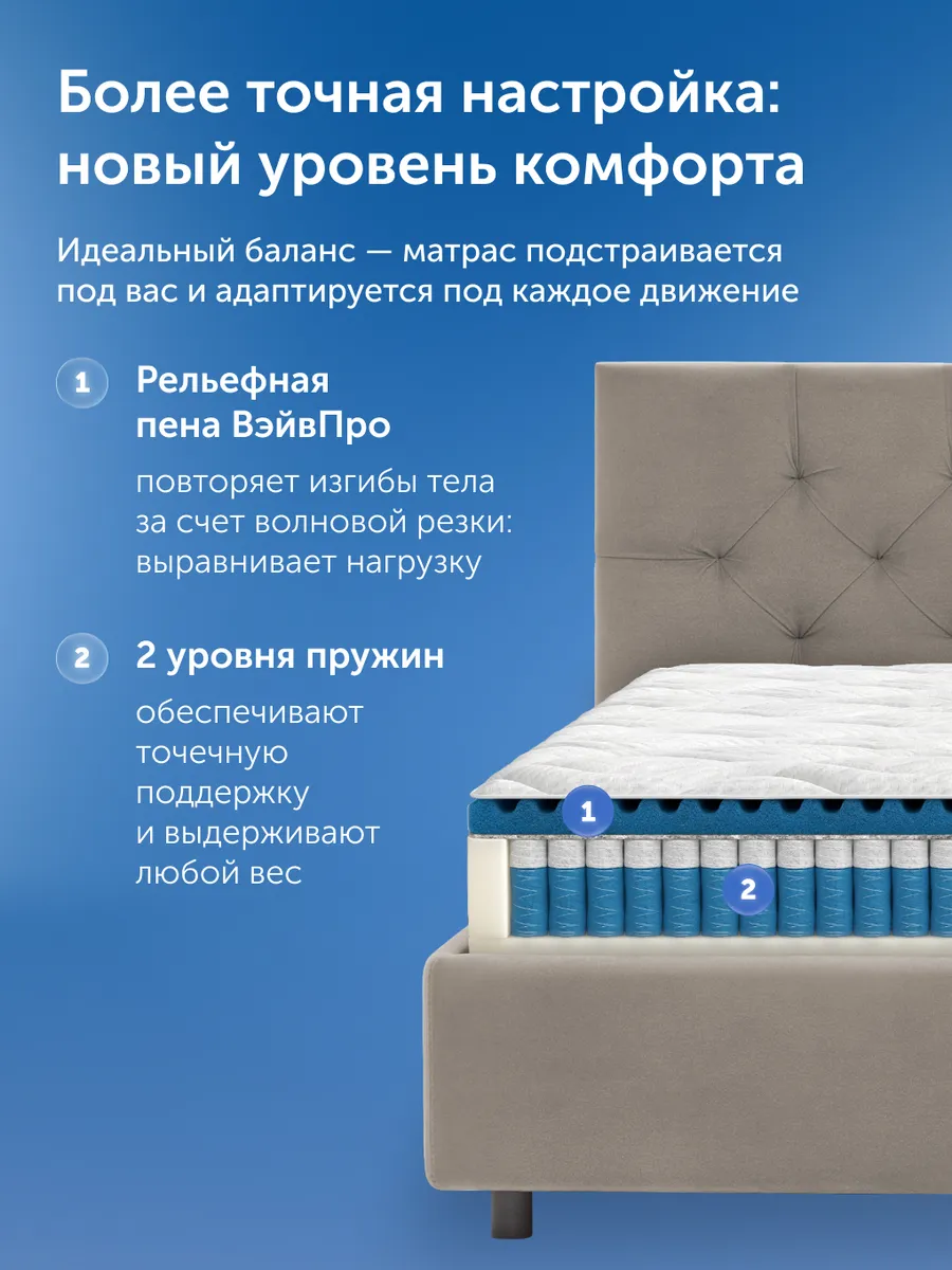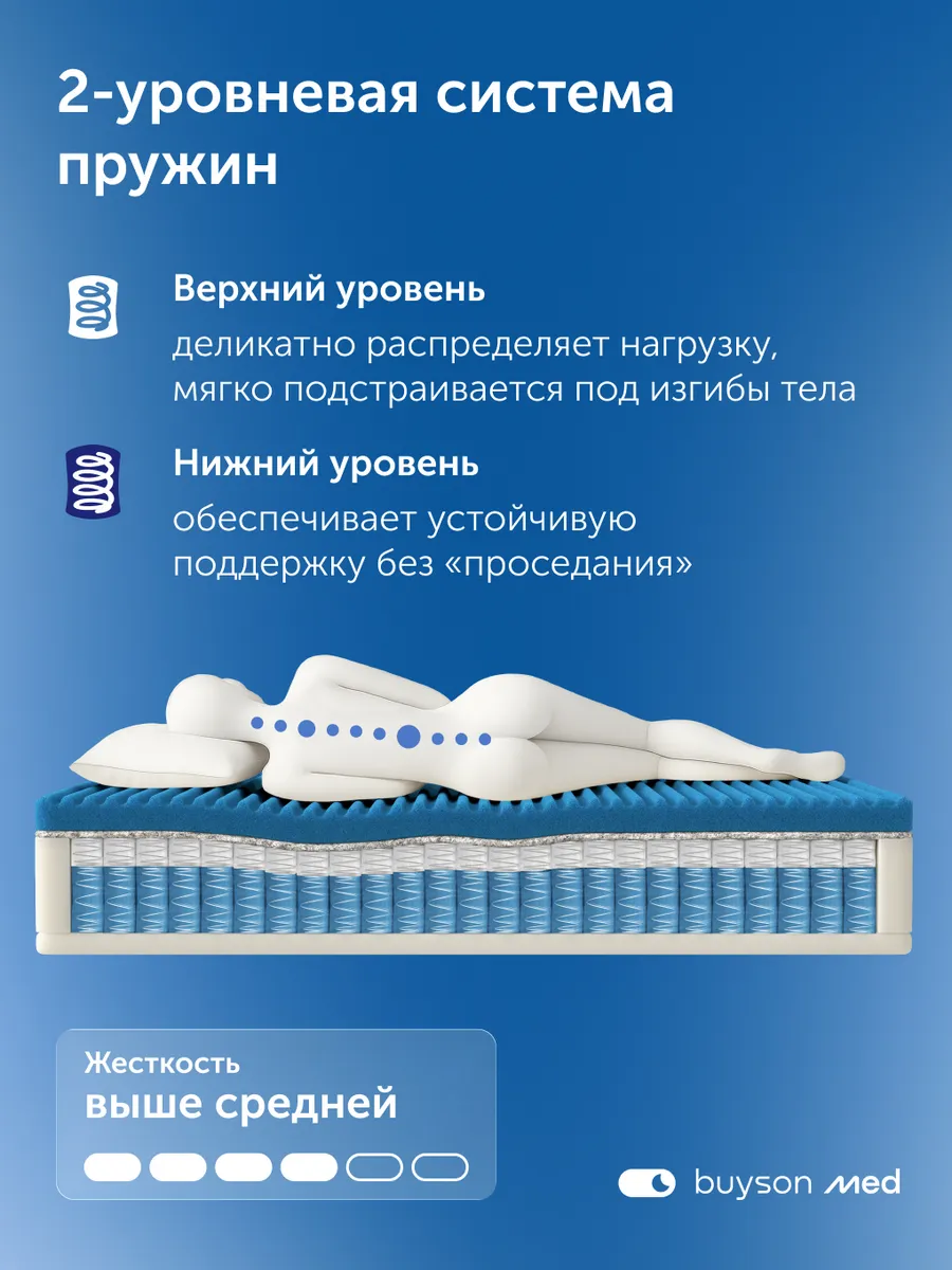 В основе матраса лежит уникальный пружинный блок высотой 21 см с усиленной пружиной диаметром 1,9 мм — медицинская точность поддержки позвоночника. Каждая пружина состоит из двух «стаканчиков» (6 и 14 см), что обеспечивает точечную реакцию на нагрузку, равномерно распределяет давление, разгружая шейный, грудной, поясничный и тазовый отделы. Это снижает мышечное напряжение и служит профилактикой болевого синдрома. Усиленный периметр из пенного короба повышенной плотности делает посадку на край и подъем безопасными, что особенно важно для пожилых и людей с ограниченной подвижностью.