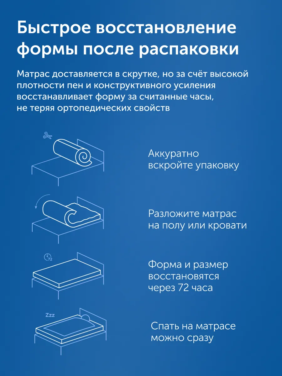 Для удобства транспортировки пружинный матрас доставляется в скрученном виде (в рулоне). После вскрытия упаковки матрас в скрутке полностью распрямится и восстановит свою форму в соответствии с заявленным размером через 72 часа, не теряя ортопедических свойств.