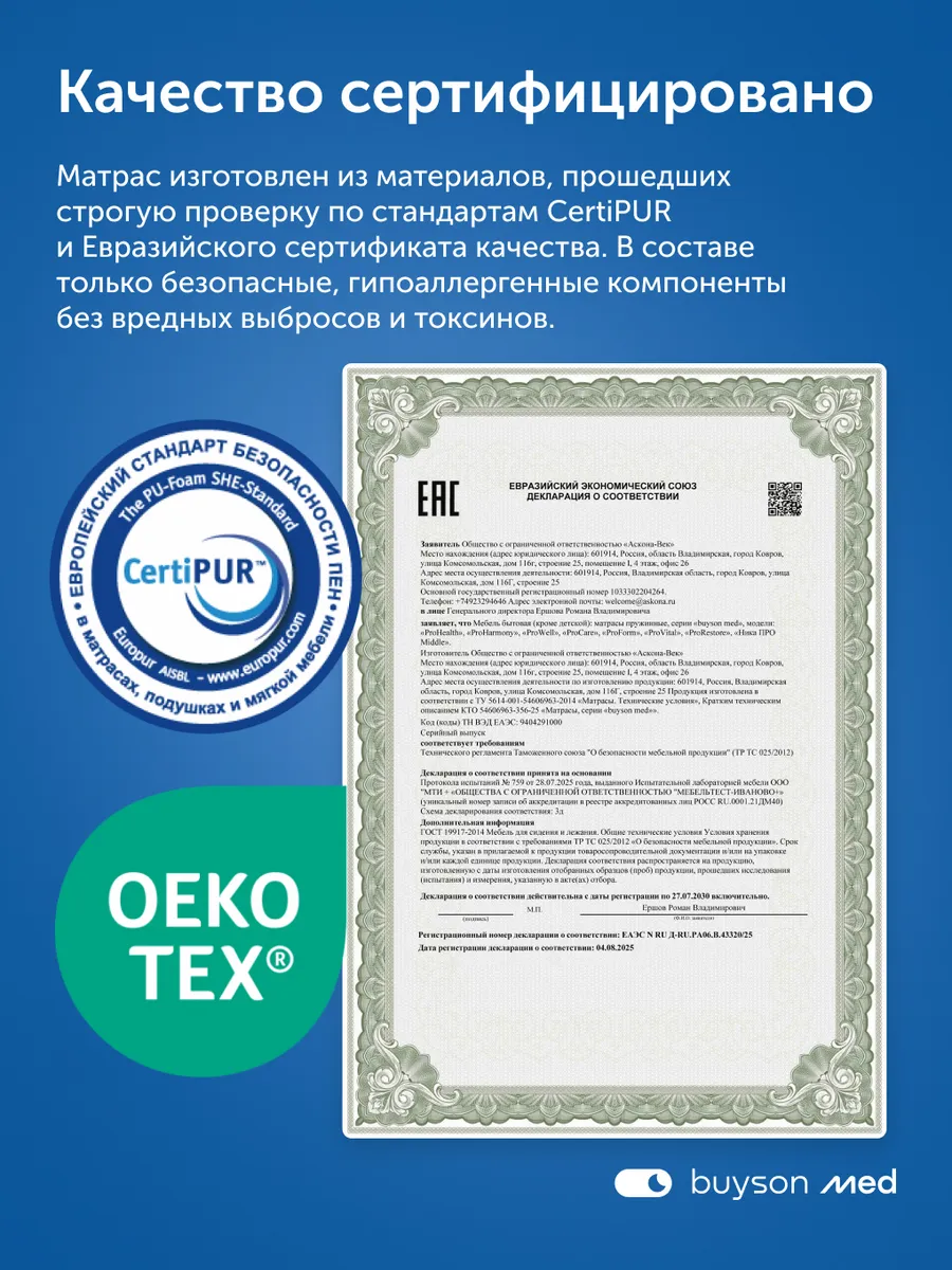 Модель имеет сертификаты OEKO-TEX и CertiPUR, подтверждающие безопасность материалов.