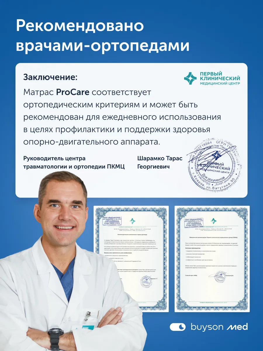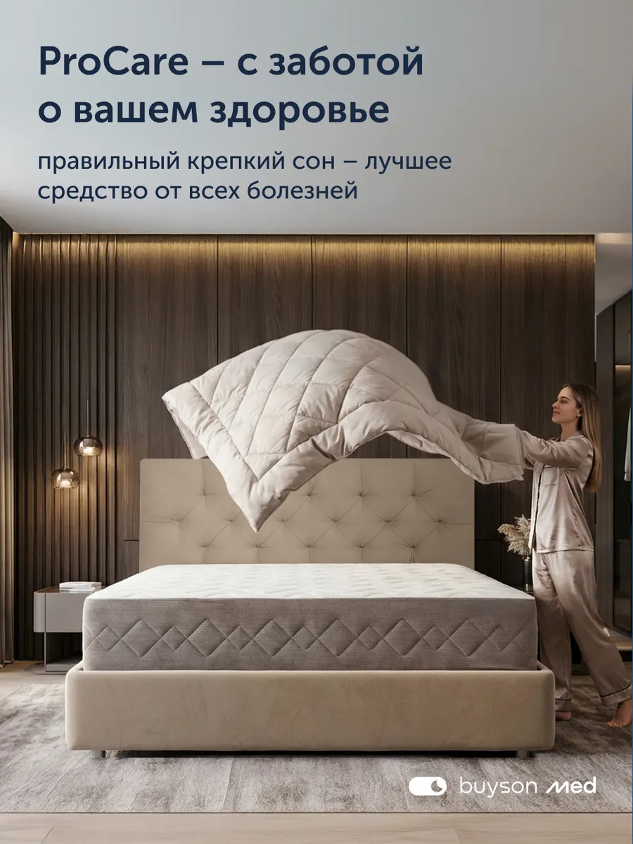 Ортопедический односторонний матрас ПроЗаботу (ProCare) из лимитированной коллекции buyson med – это инновационная конструкция с медицинским подходом, которая обеспечивает профилактику болей в спине, поддержку позвоночника и полноценное восстановление организма ночью. Матрас премиум-класса рекомендован при сидячей работе, первых признаках остеохондроза и проблемах с суставами.