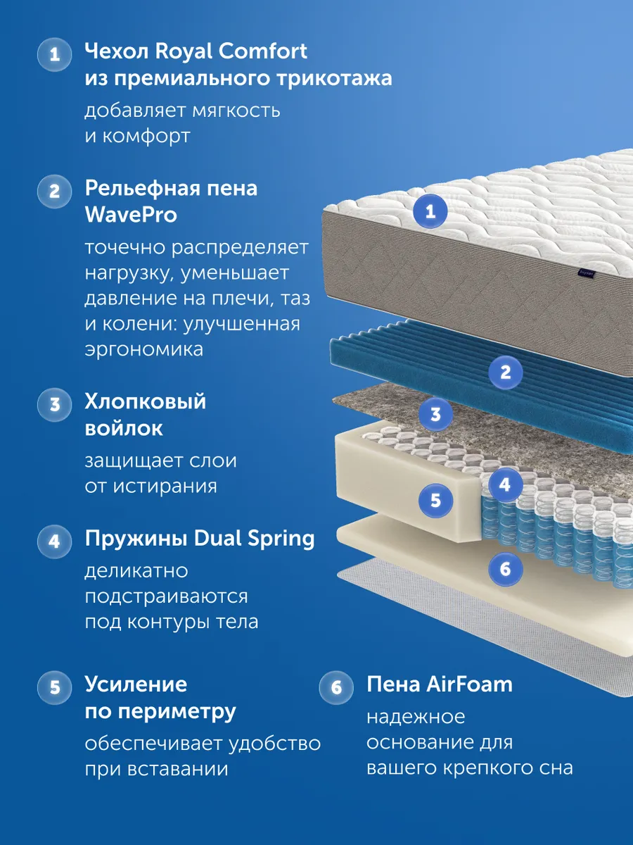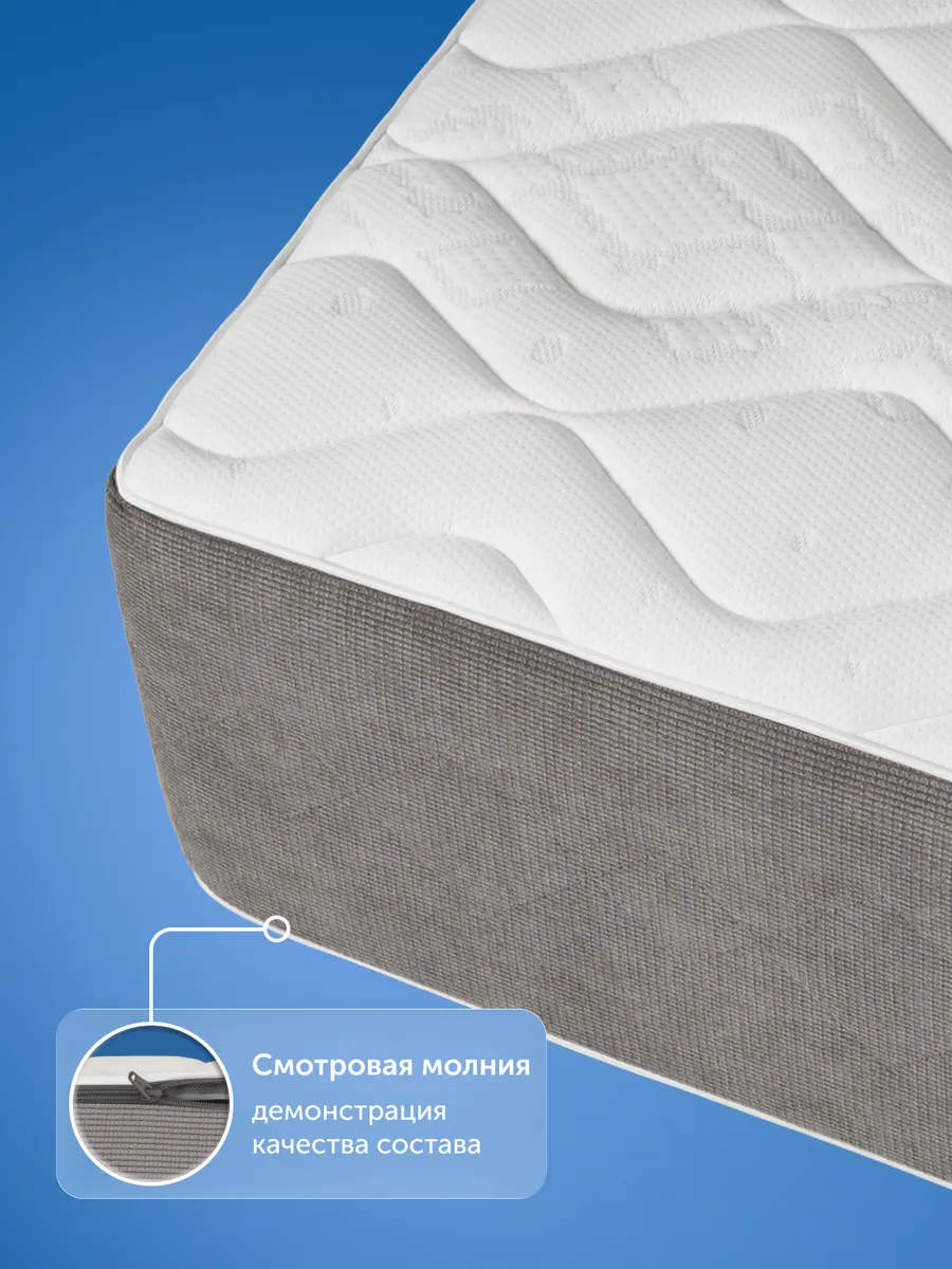 Гигиеничный верхний слой из трикотажа с объемной простёжкой на высокоэластичной пене высокой плотности (4 см) с волновой резкой создаёт микромассажный эффект и подстраивается под анатомические изгибы тела, улучшает микроциркуляцию и дарит тактильный комфорт. Материал гипоаллергенный, подходит для чувствительной кожи и людей, склонных к аллергии.