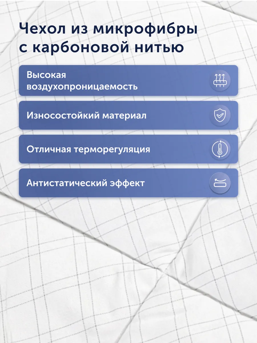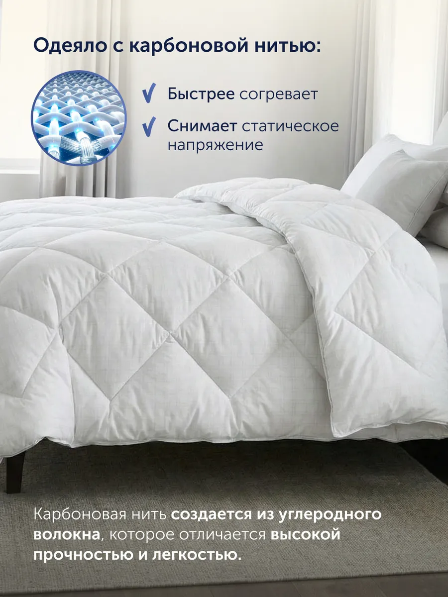 БайГлори отлично пропускает воздух и не задерживает влагу, предотвращая эффект парника и обеспечивая комфортный сон всю ночь. Особенность зимнего одеяла БайГлори — его инновационный чехол. Он изготовлен из мягкой микрофибры с добавлением карбоновой нити. Карбоновая нить, созданная из углеродного волокна, славится своей прочностью и легкостью. Благодаря ей ткань не накапливает статическое электричество и не электризуется. Кроме того, карбоновая нить улучшает терморегуляцию – вы согреетесь быстрее, чем под обычным одеялом.