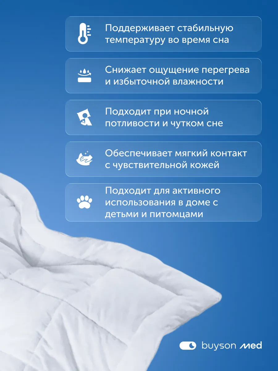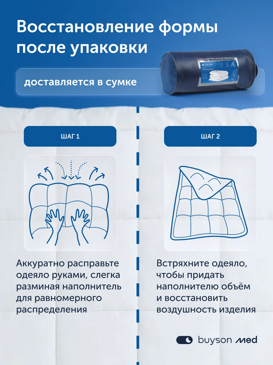 Всесезонное одеяло ПроГармонию из коллекции buyson med разработано с учётом принципов здорового микроклимата сна. Материалы в составе помогают поддерживать комфортную температуру и воздухообмен, снижая вероятность перегрева и дискомфорта.