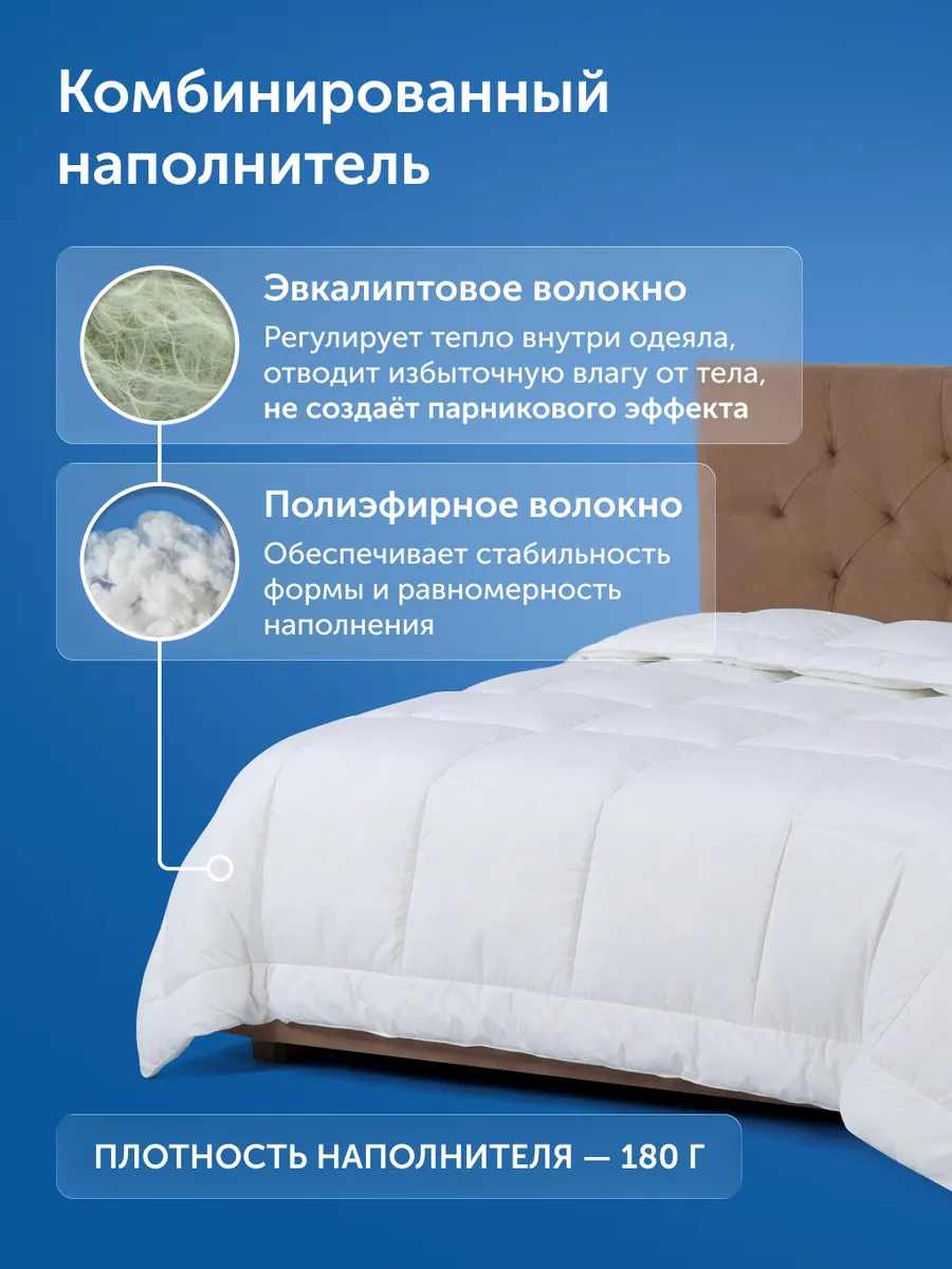 Наполнитель с натуральным эвкалиптовым и полиэфирным волокном способствует отводу избыточной влаги и поддержанию сухой внутренней среды. Сохраняет объём и форму, не сбивается при ежедневном использовании.