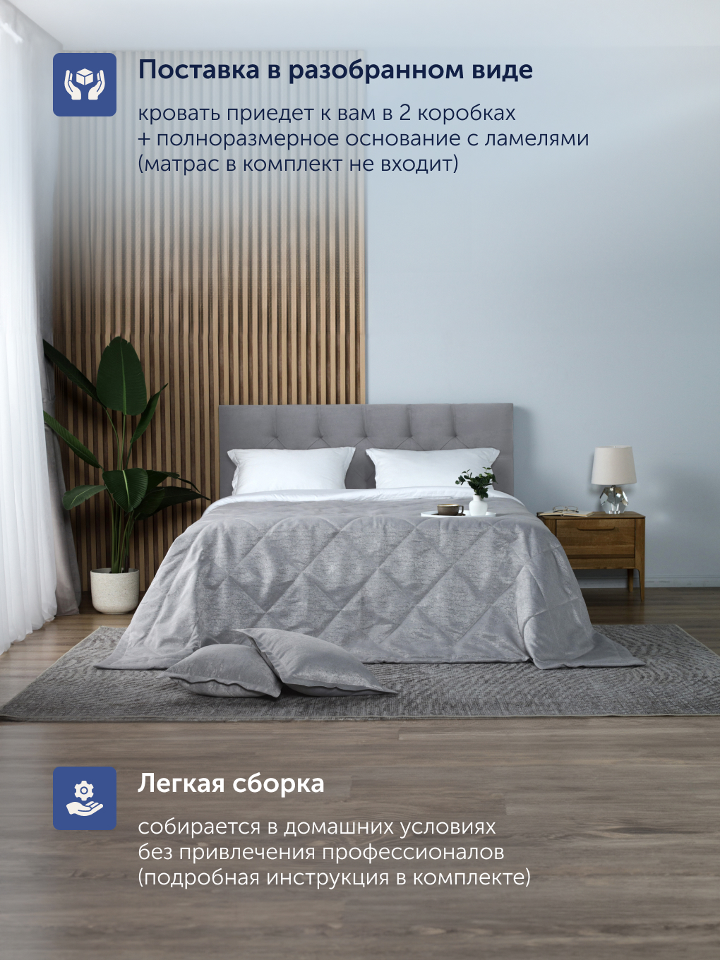 Кровать поставляется в 2 коробках + полноразмерное металлическое основание с ламелями. Легко собирается в домашних условиях, самыми простыми инструментами.