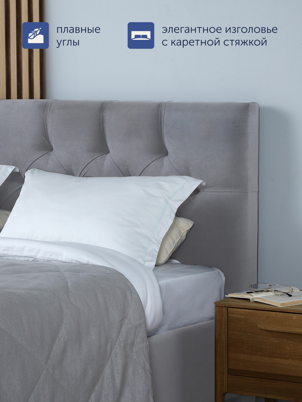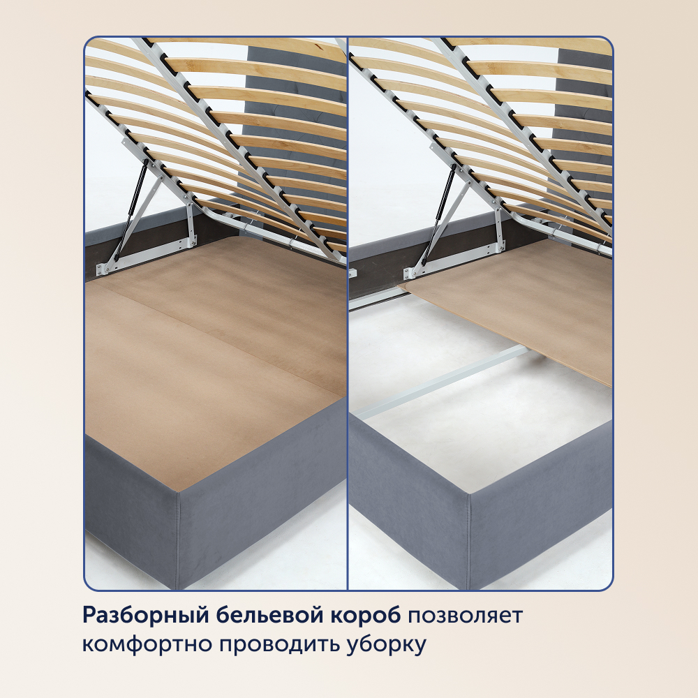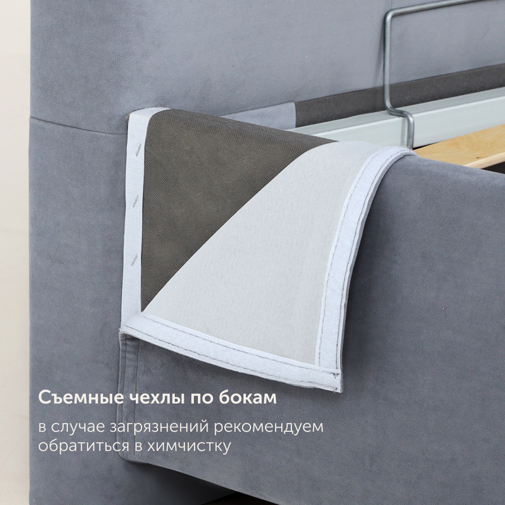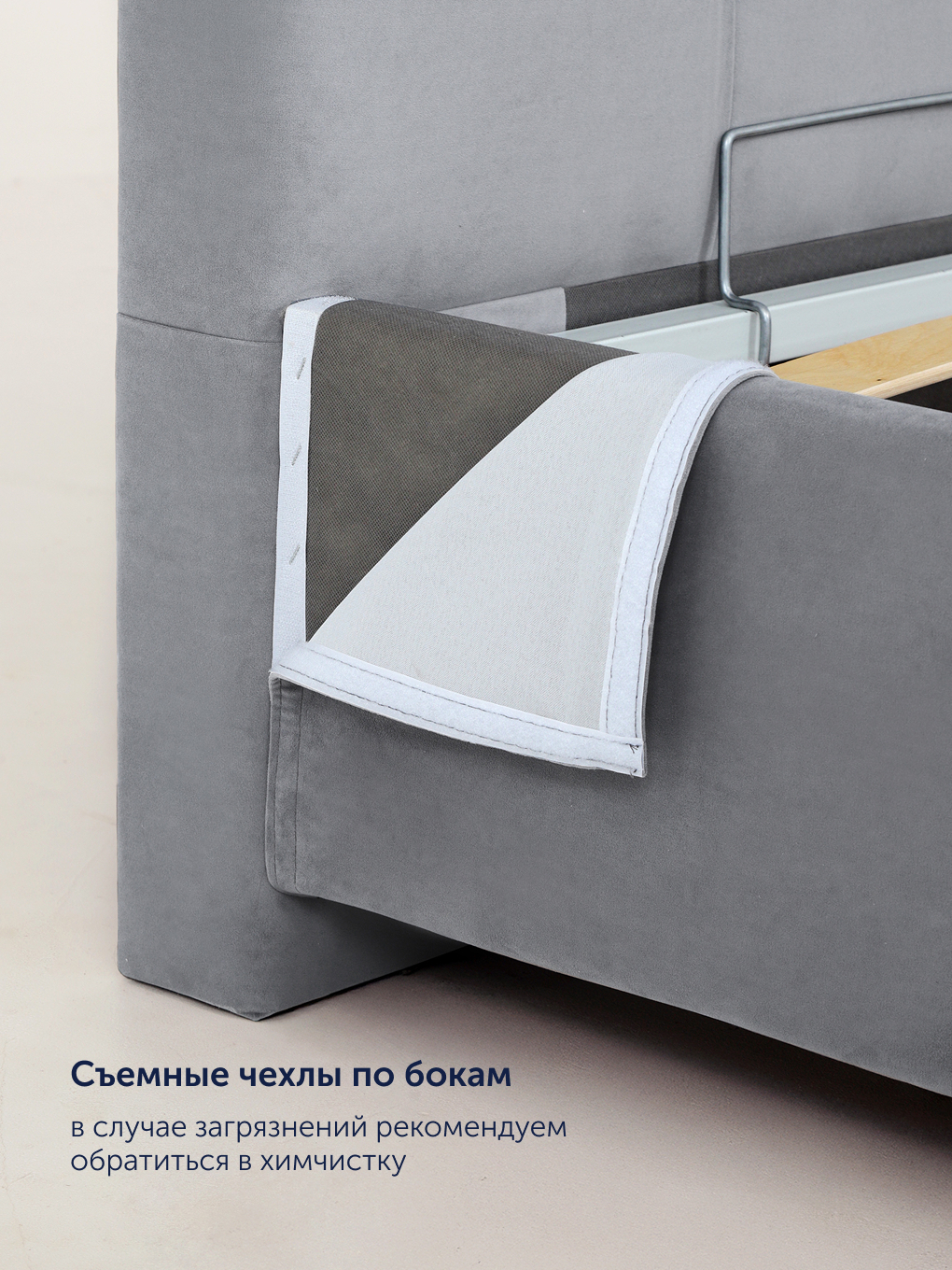 Легкий и практичный уход — съемные чехлы по бокам кровати позволяют при необходимости снять часть обивки и сдать в химчистку. Такую опцию особенно оценят владельцы домашних питомцев, а также родители маленьких детей.