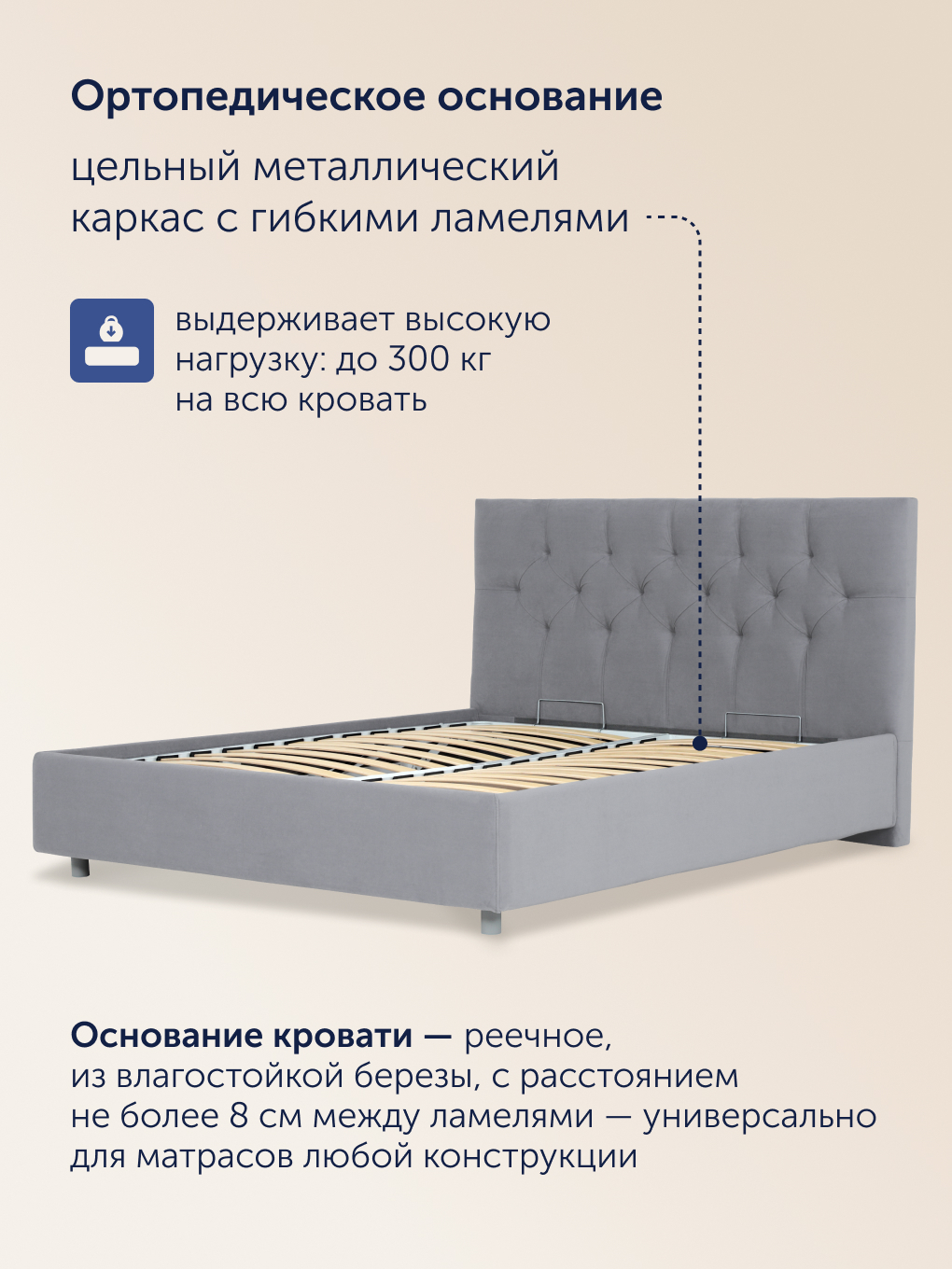 Надежное основание с гибкими деревянными ламелями повышает ортопедическую поддержку матраса и выдерживает высокие нагрузки — 300 кг (по 150 на одно спальное место, подходит для взрослых любой комплекции).
