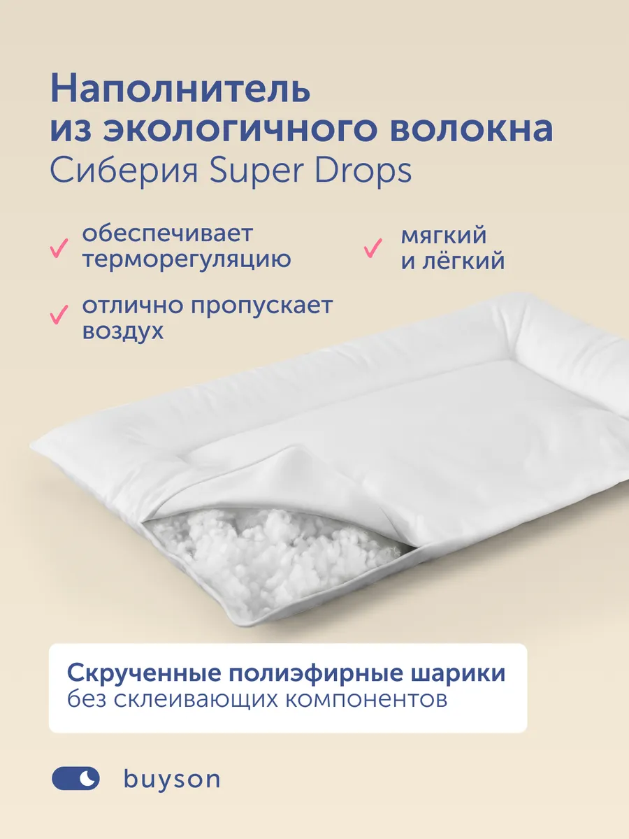 Гипоаллергенный наполнитель выполнен из современного экологичного микроволокна SuperDrops: скрученные полиэфирные шарики без склеивающих компонентов прекрасно пропускают воздух. Допускается стирка в машинке на деликатном режиме.