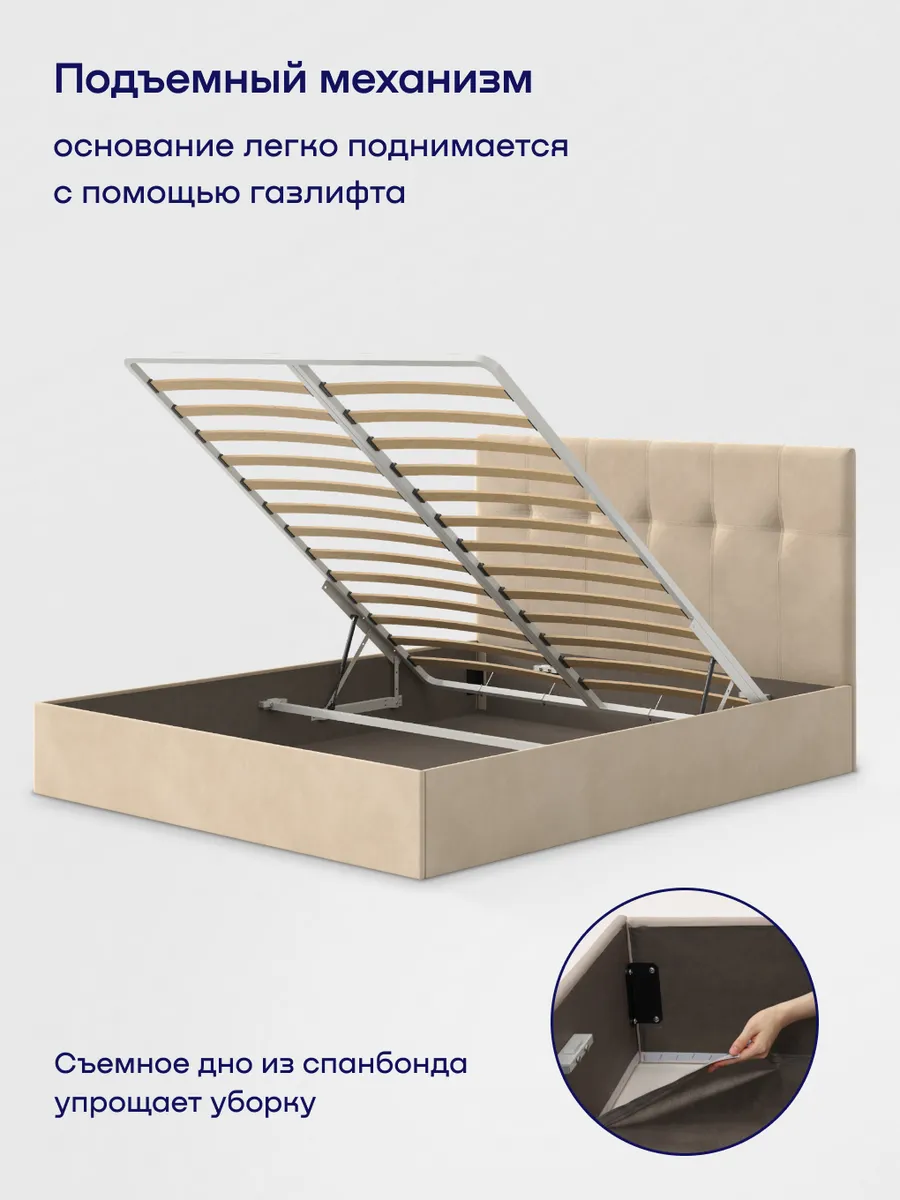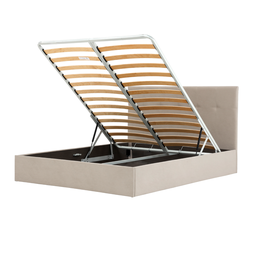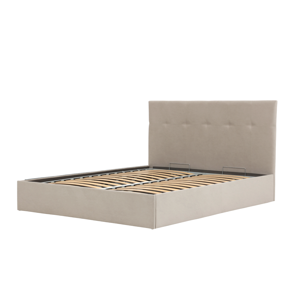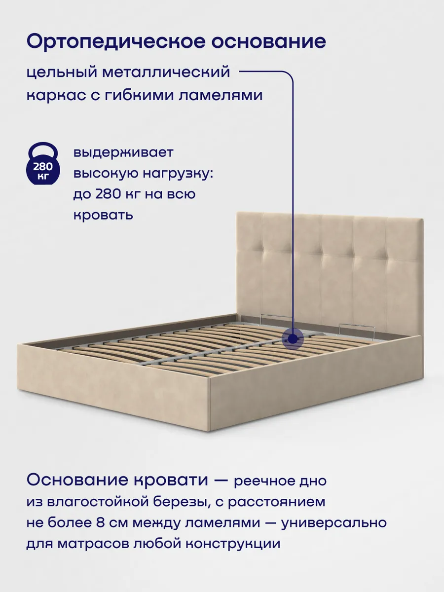 Реечное основание с гибкими ламелями надежно фиксирует положение матраса и усиливает его ортопедические свойства. Под основанием кровати предусмотрено дополнительное место для хранения: бельевой короб.
