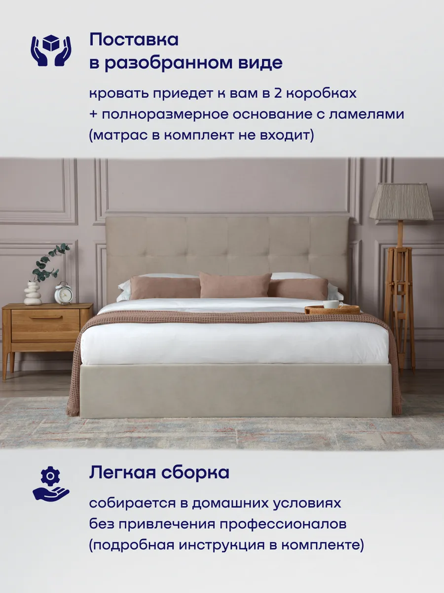 Кровать классической формы с мягкой обивкой сделает вашу спальню еще уютнее. Идеально встроится в любой интерьер. Изголовье кровати имеет декоративные отстрочки. Долговечный обивочный материал высокого качества – мебельный велюр (микровелюр, более технологичный вариант микрофибры). Ткань приятная на ощупь, не выцветает и легко поддается чистке.