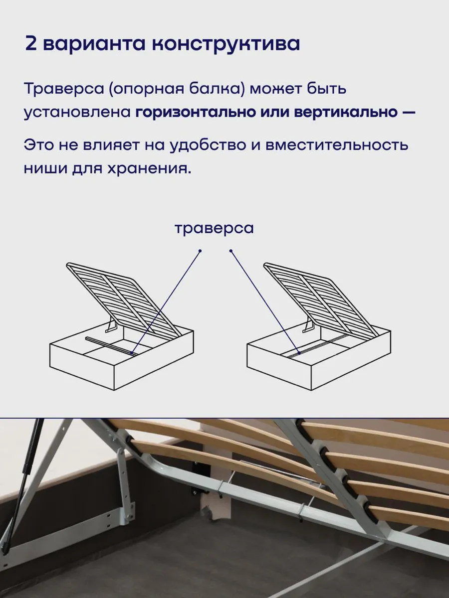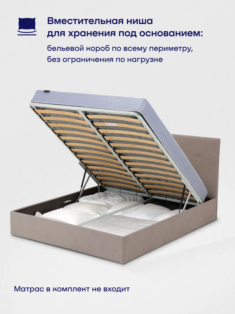 Реечное основание с гибкими ламелями надежно фиксирует положение матраса и усиливает его ортопедические свойства. Под основанием кровати предусмотрено дополнительное место для хранения: бельевой короб.