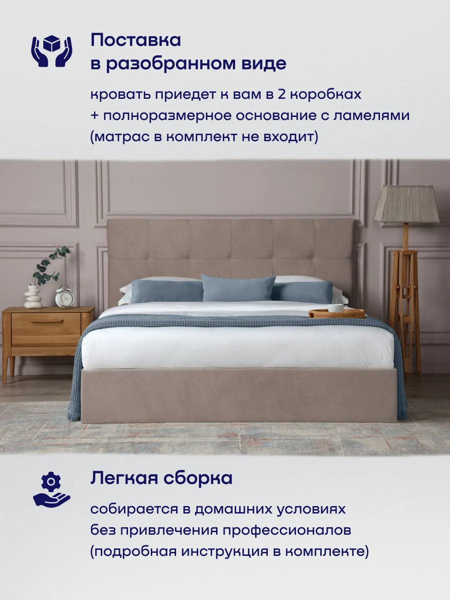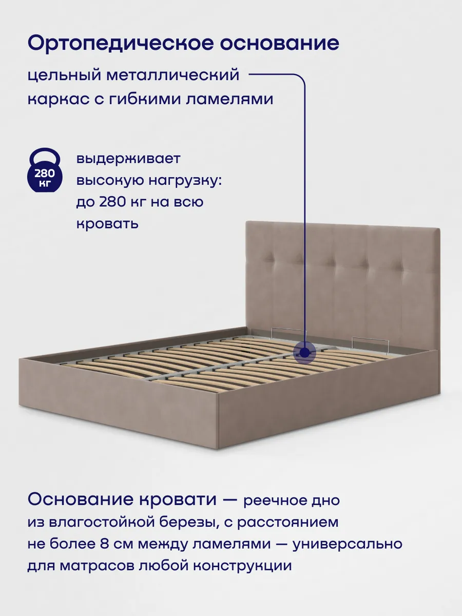 Кровать классической формы с мягкой обивкой сделает вашу спальню еще уютнее. Идеально встроится в любой интерьер. Изголовье кровати имеет декоративные отстрочки. Долговечный обивочный материал высокого качества – мебельный велюр (микровелюр, более технологичный вариант микрофибры), в стильном оттенке капучино. Ткань приятная на ощупь, не выцветает и легко поддается чистке.