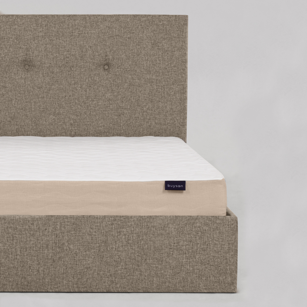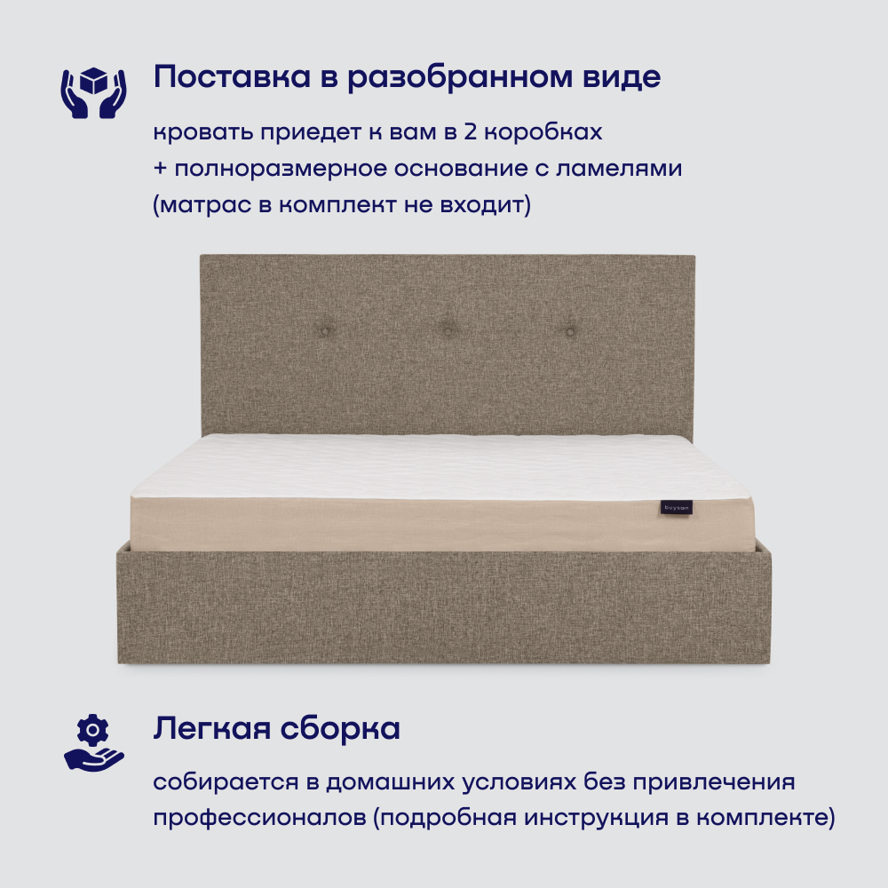Ортопедическое основание с гибкими деревянными ламелями повышает ортопедические свойства матраса (обратите внимание - матрас в комплект не входит, продается отдельно). Если вы планируете купить кровать с матрасом, рекомендуем дополнить покупку матрасом бренда buyson в соответствующем размере. С учетом того, что царги кровати невысокие, а матрас немного «утопает» в периметре кровати (на 5,5 см), рекомендуем выбрать матрас повыше – от 14 до 30 см.