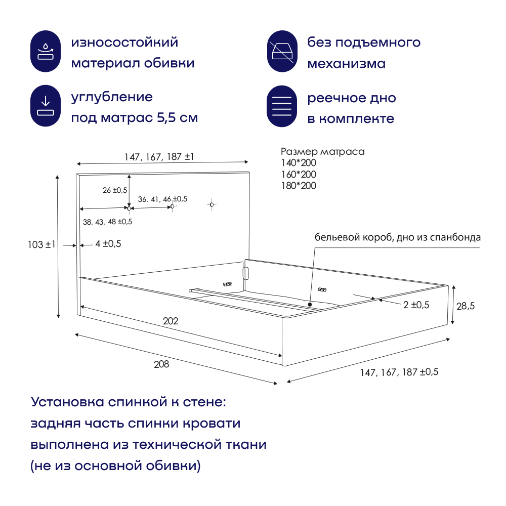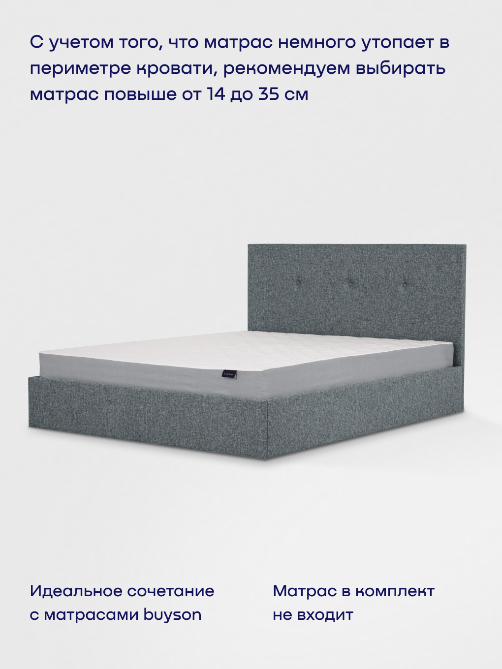 Ортопедическое основание с гибкими деревянными ламелями повышает ортопедические свойства матраса (обратите внимание - матрас в комплект не входит, продается отдельно). Если вы планируете купить кровать с матрасом, рекомендуем дополнить покупку матрасом бренда buyson в соответствующем размере. С учетом того, что царги кровати невысокие, а матрас немного «утопает» в периметре кровати (на 5,5 см), рекомендуем выбрать матрас повыше – от 14 до 30 см. Кровать доставляется в разобранном виде (разборный каркас кровати и цельное металлическое основание с деревянными ламелями). Ее можно собрать собственными силами, имея под рукой простые инструменты. При самостоятельной сборке убедительно просим проводить видеофиксацию распаковки товара во избежание претензий по комплектации.