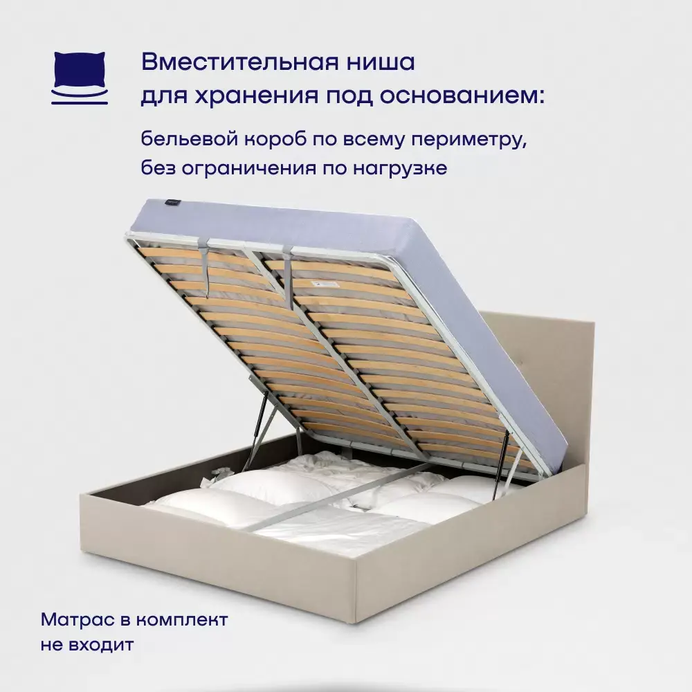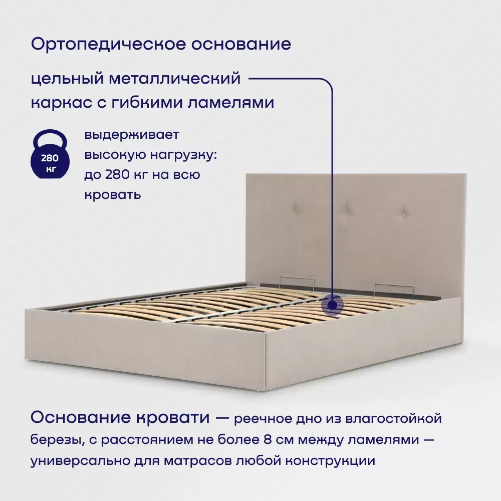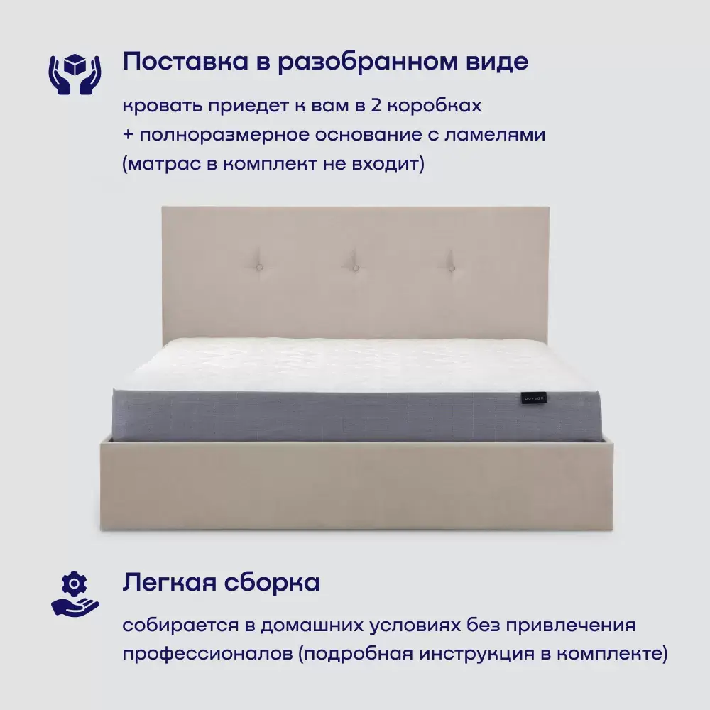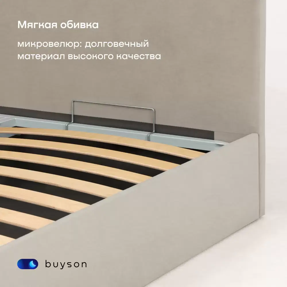 Ортопедическое основание с гибкими ламелями повышает ортопедические свойства матраса (обратите внимание - матрас в комплект не входит, продается отдельно). Если вы планируете купить кровать с матрасом, рекомендуем дополнить покупку матрасом того же бренда buyson в соответствующем размере. С учетом того, что царги кровати невысокие, а матрас немного «утопает» в периметре кровати (на 5,5 см), рекомендуем выбрать матрас повыше – от 14 до 30 см.