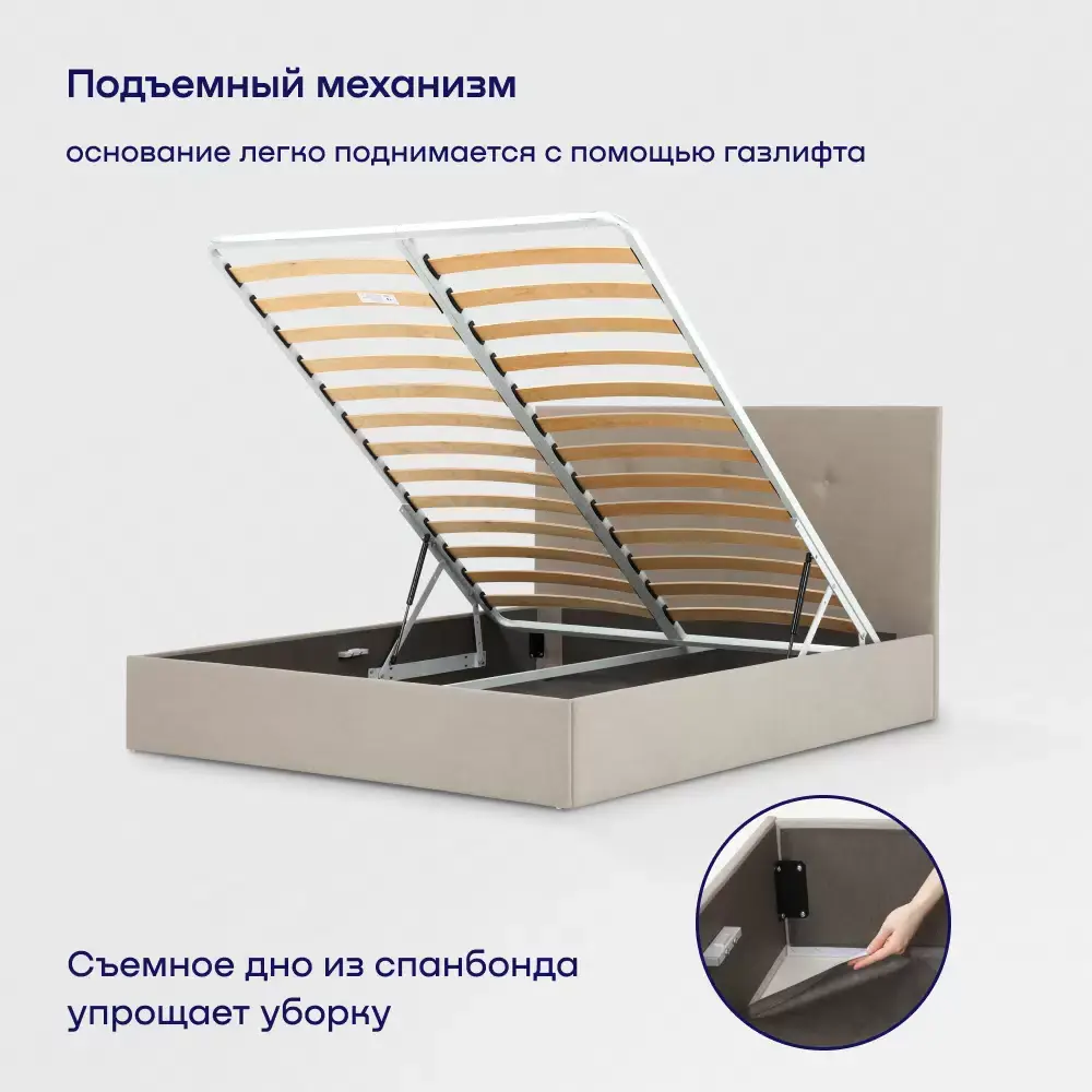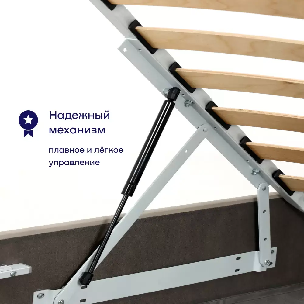 Кровать с подъемным механизмом позволяет решить вопрос хранения вещей: под основанием предусмотрено дополнительное место, куда можно убрать постельное белье, детские игрушки и т.д. – вместительный бельевой ящик по всему периметру кровати.